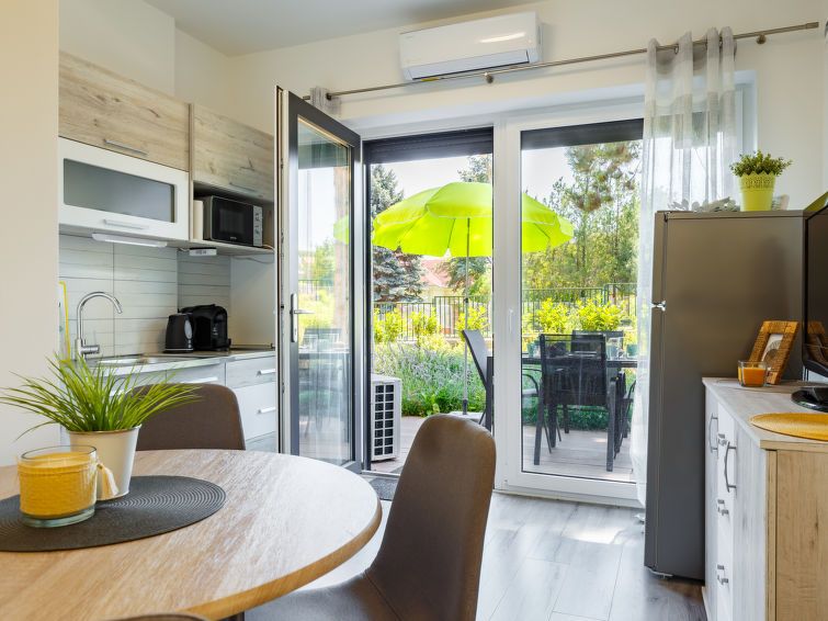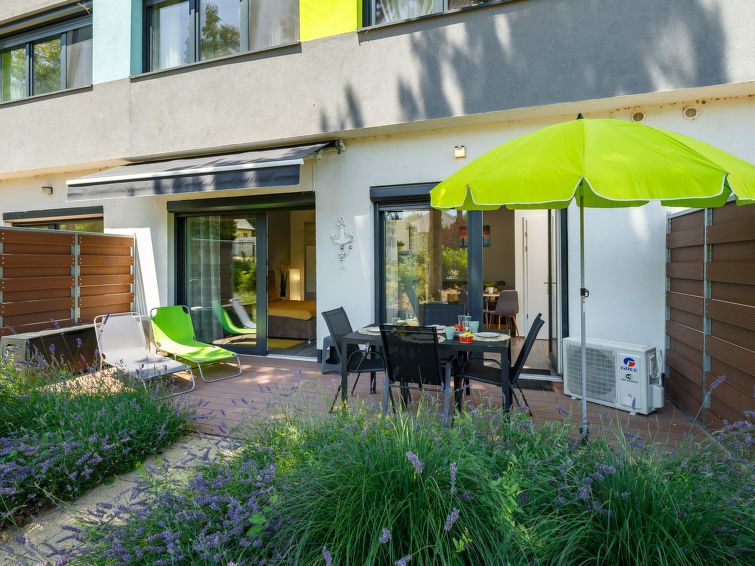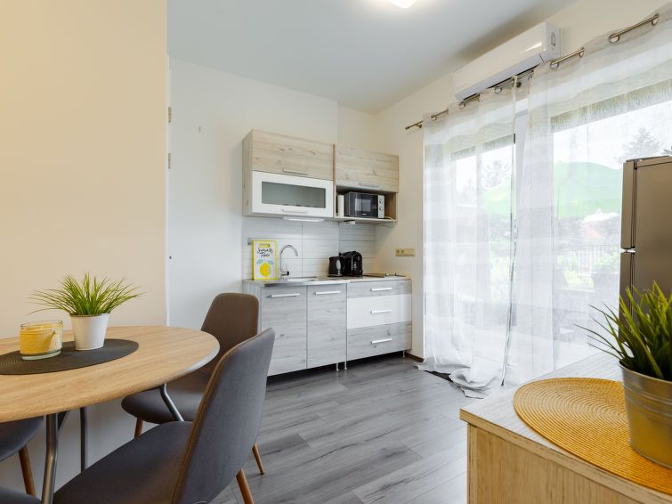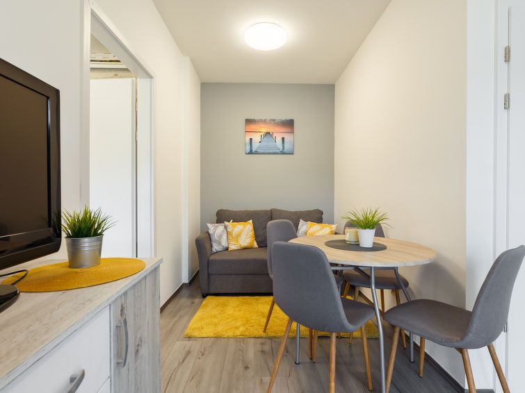 "Juventus", 2-room apartment 28 m2, on the ground floor. Beautiful and modern furnishings: living/sleeping room with 1 pull-out bed (2 pers.), cable TV and air conditioning. Exit to the terrace. 1 room with 1 french bed (160 cm, length 200 cm), cable TV and air conditioning. Open kitchen (2 hot plates, microwave, freezer, electric coffee machine).