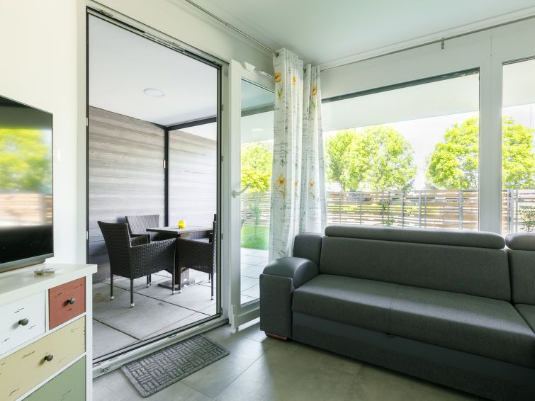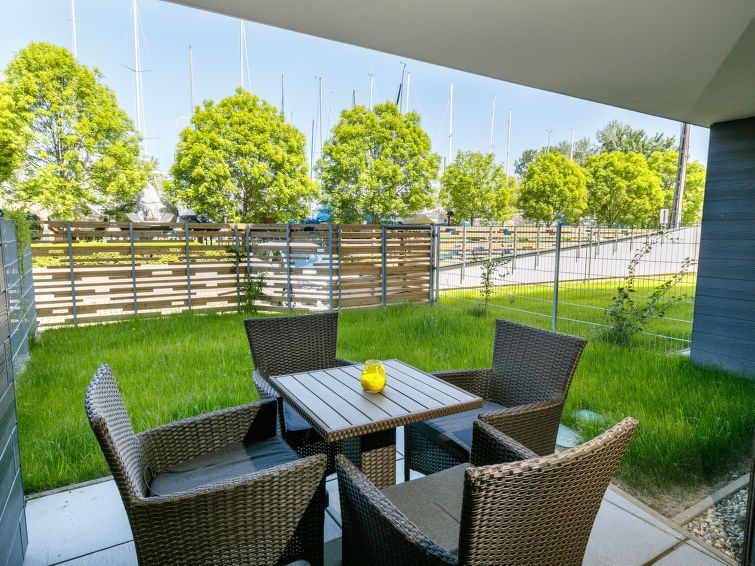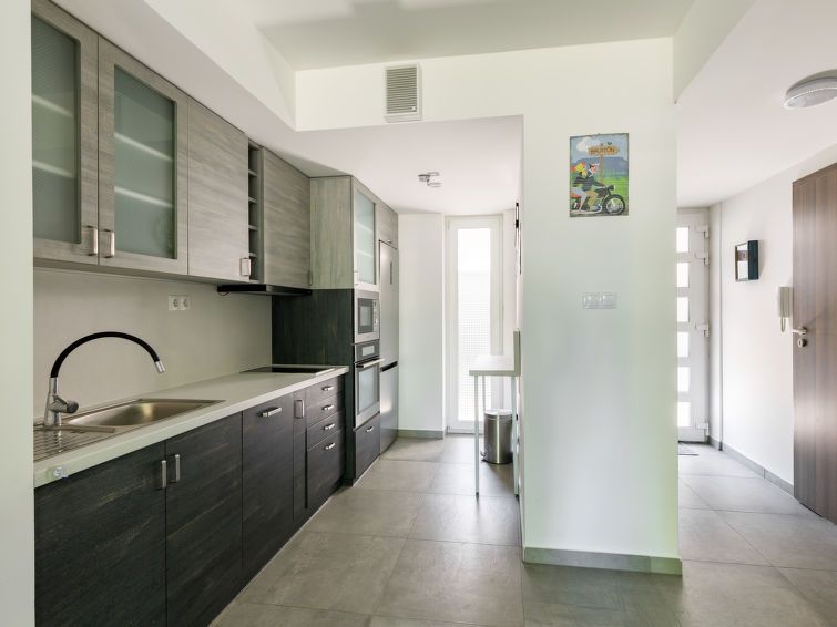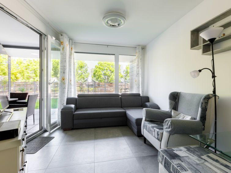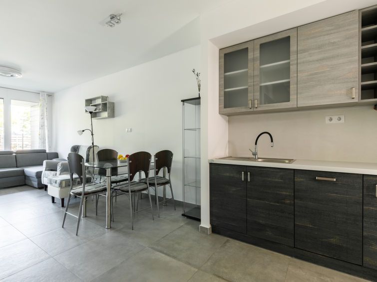 Beautiful apartment with terrace, in a good location. Nice, relatively quiet place from which you can easily get everywhere. Grocery store and restaurants nearby. A small grill on the terrace and a larger table would be nice. The kitchen is very sparingly equipped for 4 people (plates, glasses, cutlery, bowls, pots and accessories). Sun loungers and umbrellas would be great at the pool. The beautiful beach is only a few minutes' walk away. Key handover could be better organized.