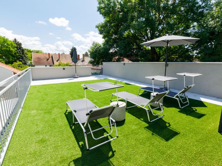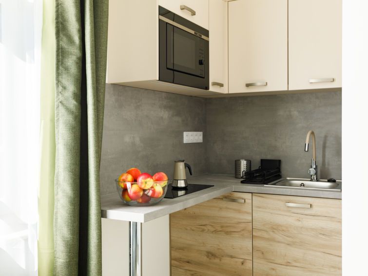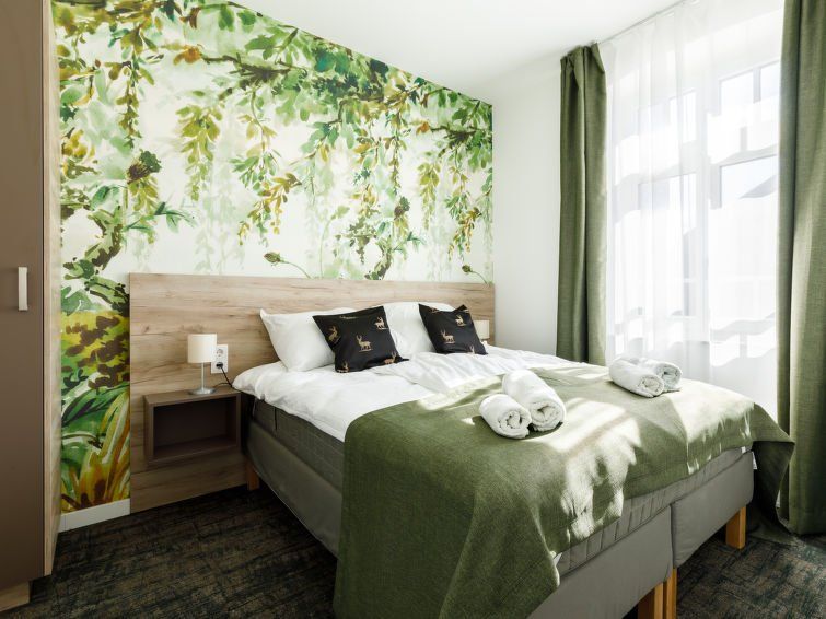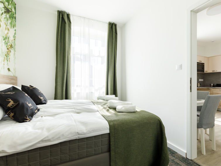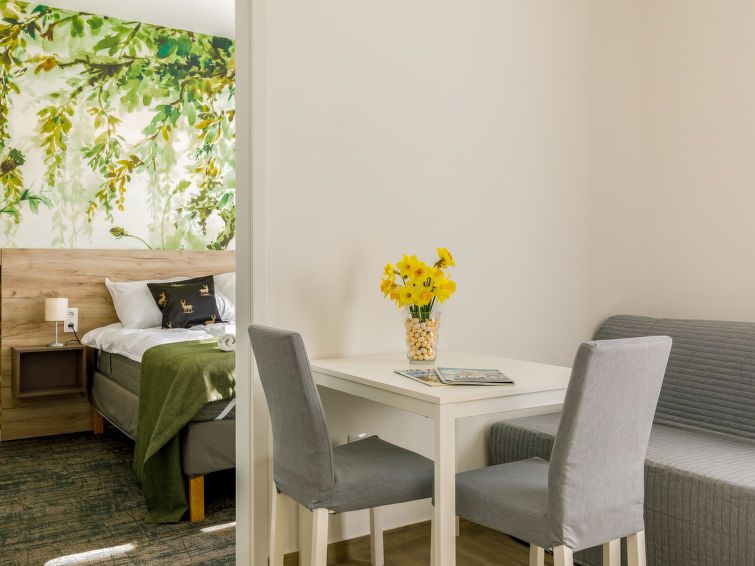 "Park 1", 2-room apartment on the ground floor. Beautiful and modern furnishings: open living/dining room with 1 pull-out bed and cable TV (flat screen). 1 double bedroom with 1 french bed (160 cm, length 200 cm). Small, open kitchen (2 ceramic glass hob hotplates, microwave, electric coffee machine).