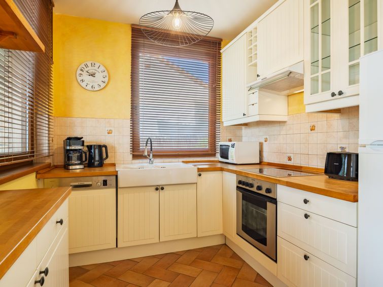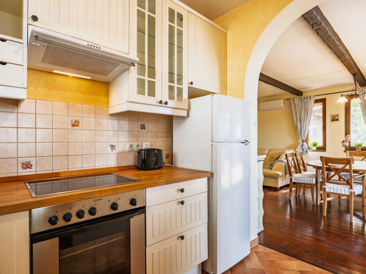 Object suitable for 8 adults. Spacious and bright, tasteful and romantic furnishings: living/dining room with dining table, cable TV and air conditioning. Exit to the terrace. 2 double bedrooms, each room with 1 french bed (160 cm, length 200 cm), air conditioning. Open kitchen (oven, dishwasher, 4 ceramic glass hob hotplates, toaster, kettle, microwave, freezer, electric coffee machine).