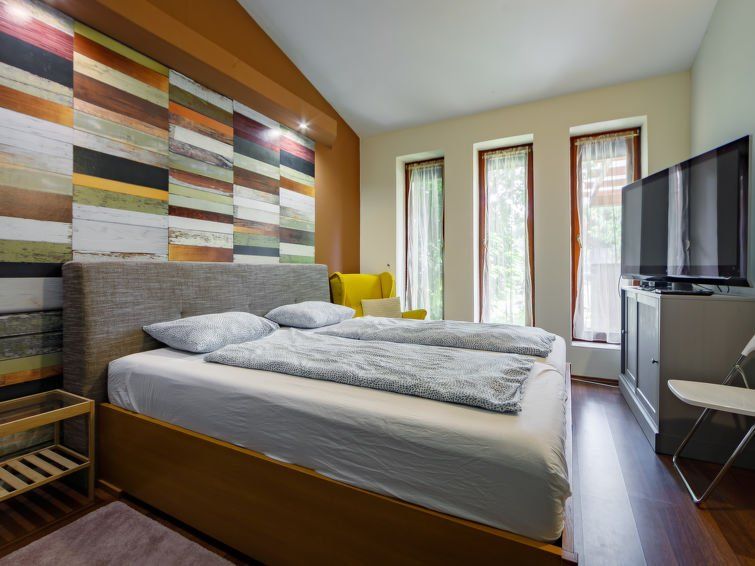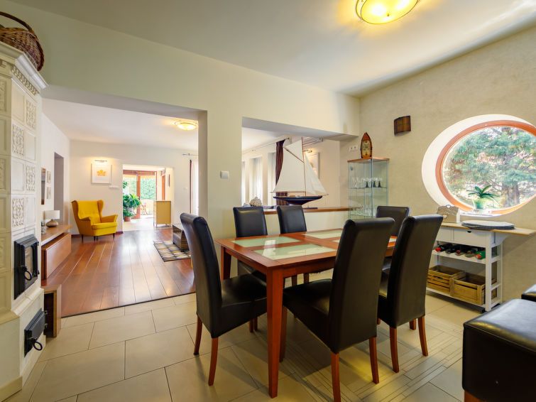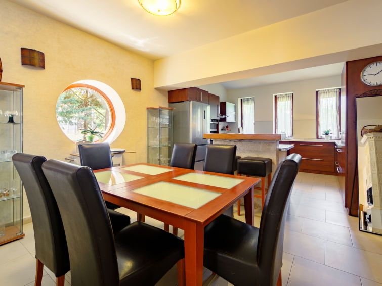 5-room house 210 m2. Spacious, beautiful and modern furnishings: living room with 1 double sofabed (2 pers.), satellite TV, flat screen and air conditioning. Exit to the terrace. 1 room with 1 french bed (180 cm, length 200 cm). Large kitchen 30 m2 (4 hot plates, oven, dishwasher, microwave, freezer) with dining table.