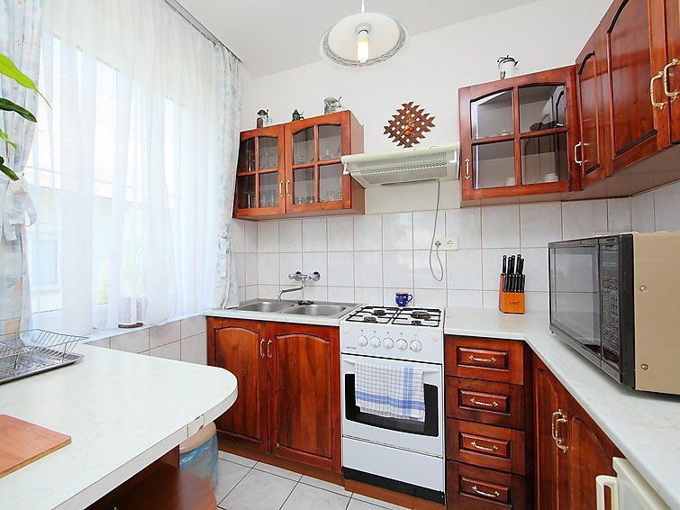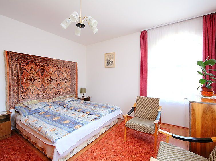 9-room house 160 m2. Practical furnishings: living room with satellite TV. Exit to the terrace. 2 rooms, each room with 2 beds. Open kitchen (4 hot plates, oven, microwave) with dining table. Bath/WC, sep. WC. No heating option. Upper floor: dining room with satellite TV. 4 rooms, each room with 2 beds.