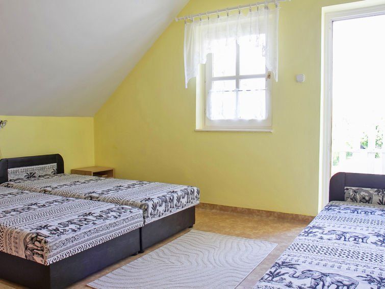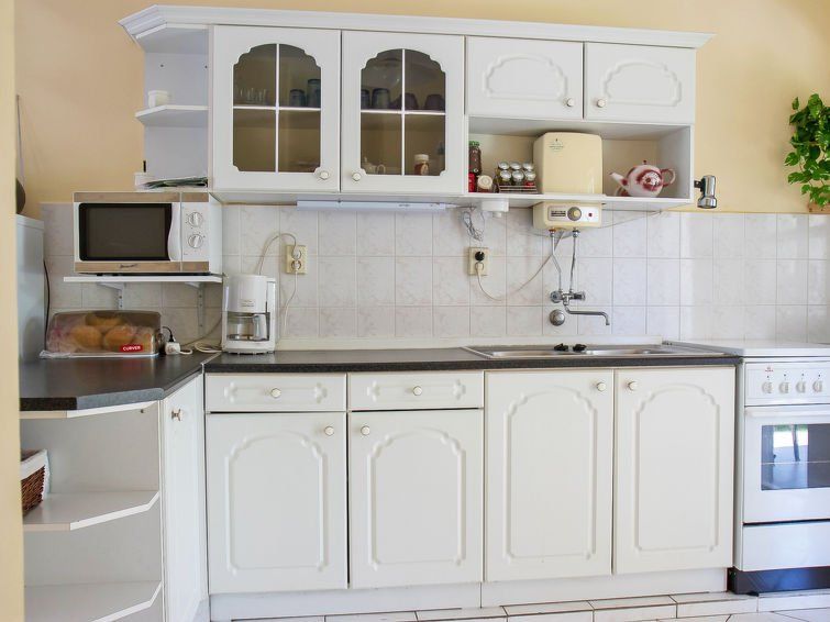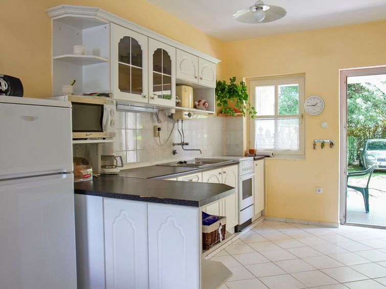 3-room semi-detached house 80 m2. Practical furnishings: living room with satellite TV. Exit to the terrace. Open kitchen (4 hot plates, oven, microwave). Upper floor: 1 room with 1 double bed and air conditioning. 1 room with 1 bed, 1 double bed and air conditioning. Exit to the balcony.