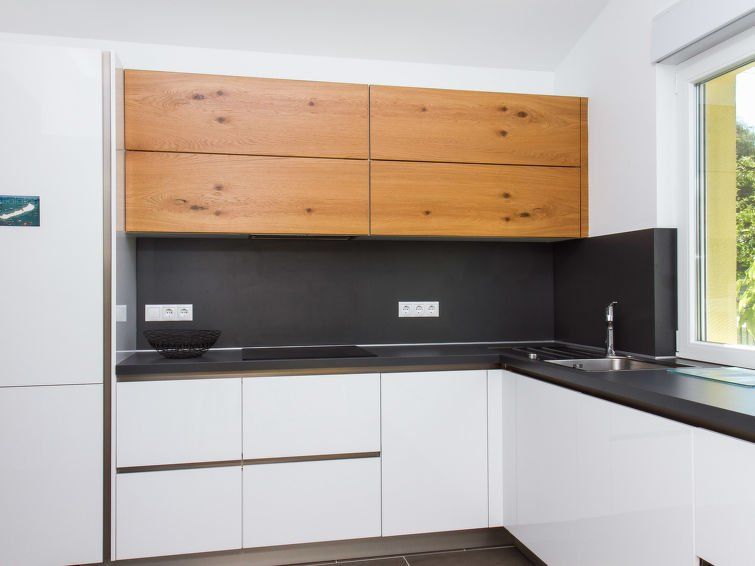 5-room house. Beautiful and modern furnishings: entrance hall. 2 rooms, each room with 1 french bed. Kitchen (4 hot plates, oven, dishwasher, microwave) with dining nook. Shower/WC. No heating option. Upper floor: living room. 2 rooms, each room with 2 beds. Shower, sep. WC. Terrace.