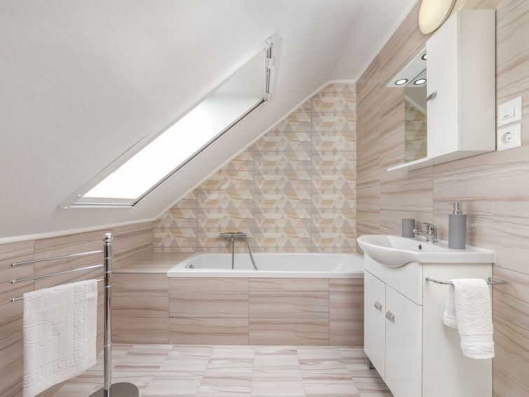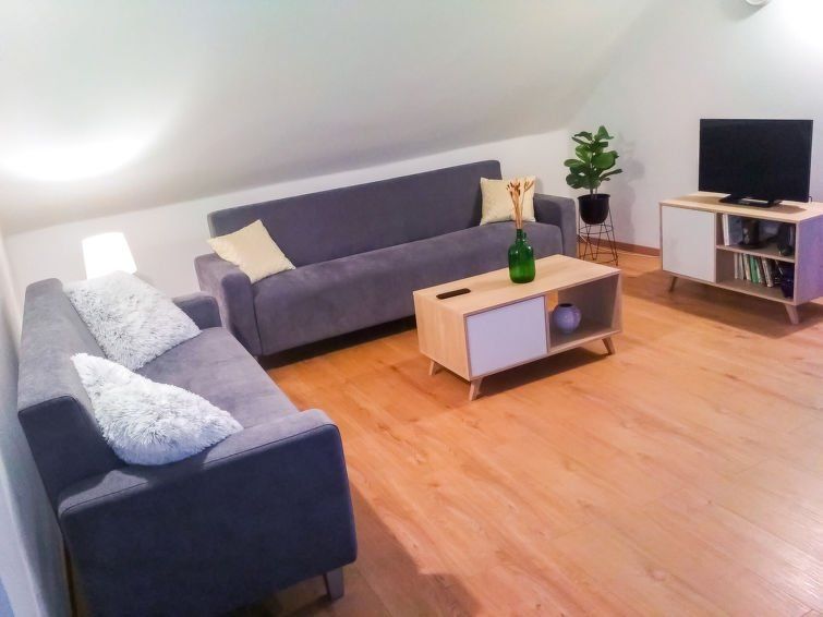 6-room house 160 m2 on 2 levels. Partly with sloping ceilings, cosy furnishings: living/dining room with satellite TV. Exit to the terrace. 1 room with 1 french bed. 1 room with 1 pull-out bed (2 pers.). Small kitchen (4 hot plates, oven, microwave, freezer). Bath/WC. No heating option.