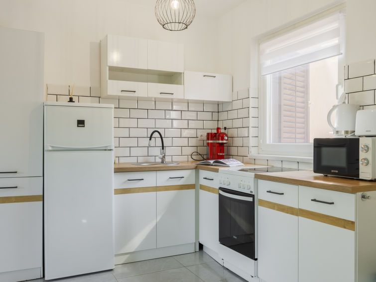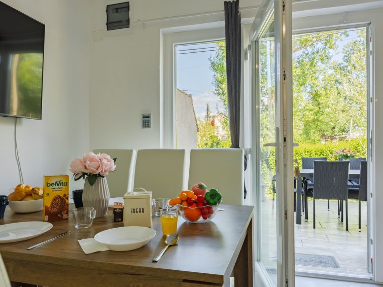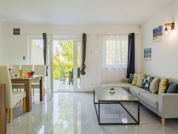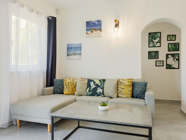 6-room house on 2 levels. Comfortable and modern furnishings: living/dining room with 1 double sofabed (140 cm, length 200 cm), dining table, digital TV, international TV channels and air conditioning. Exit to the terrace. 2 double bedrooms, each room with 1 french bed (160 cm, length 200 cm), digital TV.