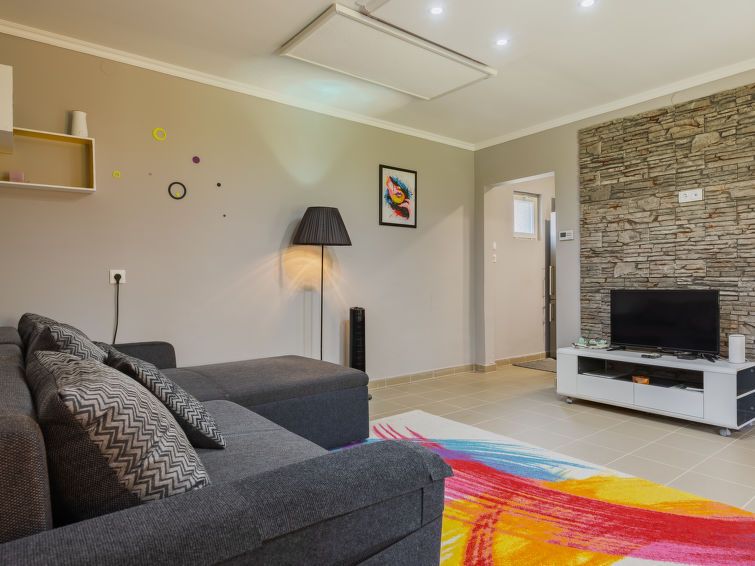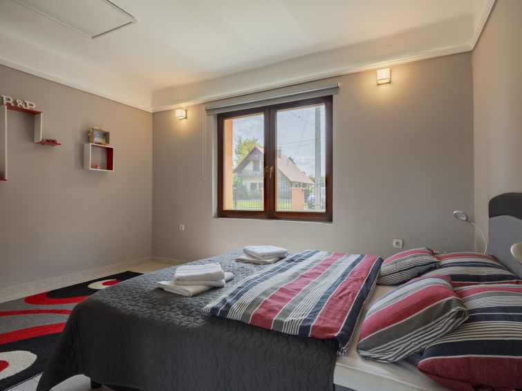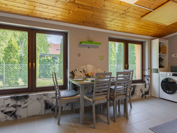 3-room semi-detached house. Practical and comfortable furnishings: dining room with dining table. Exit to the garden. Living room with cable TV and international TV channels. 1 double bedroom with 1 french bed (160 cm, length 200 cm). 1 room with 2 beds (80 cm, length 200 cm). Small kitchen (oven, 2 ceramic glass hob hotplates, toaster, kettle, microwave, freezer).