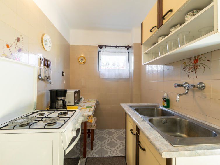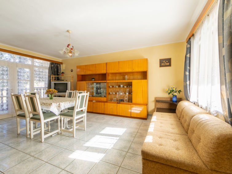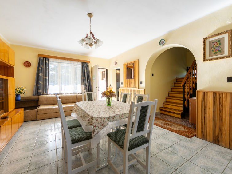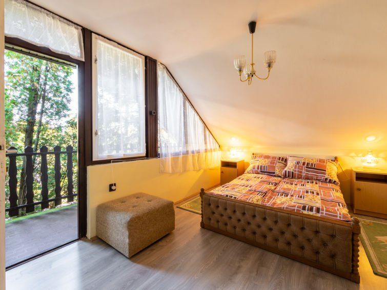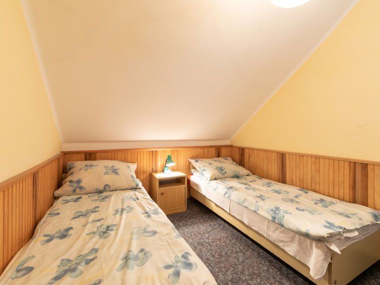 5-room house 80 m2 on 2 levels. Practical furnishings: living room with satellite TV. Exit to the terrace. 1 room with 1 pull-out bed (2 pers.). Small kitchen (4 hot plates, oven, freezer). Shower/WC. No heating option. Upper floor: entrance hall with kitchen corner. 1 room with 1 french bed.