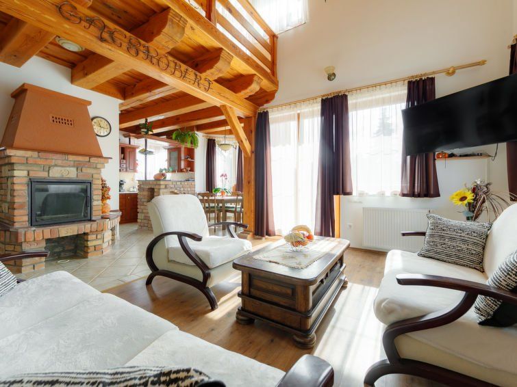 "Kaldi", 4-room apartment 120 m2 on 2 levels. Object suitable for 6 adults + 1 child. Comfortable and beautiful furnishings: entrance hall. Living room with open-hearth fireplace, cable TV and air conditioning. Exit to the balcony. 1 room with 1 french bed. Open kitchen (4 hot plates, oven, dishwasher, microwave).