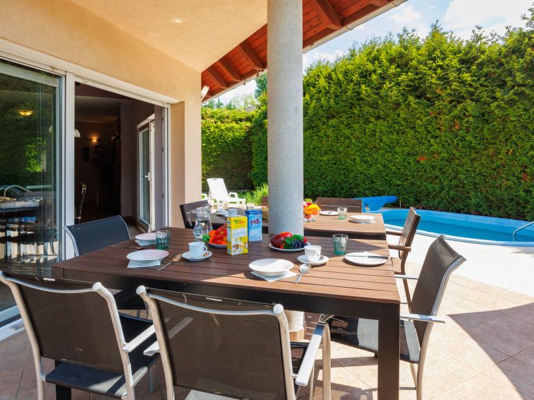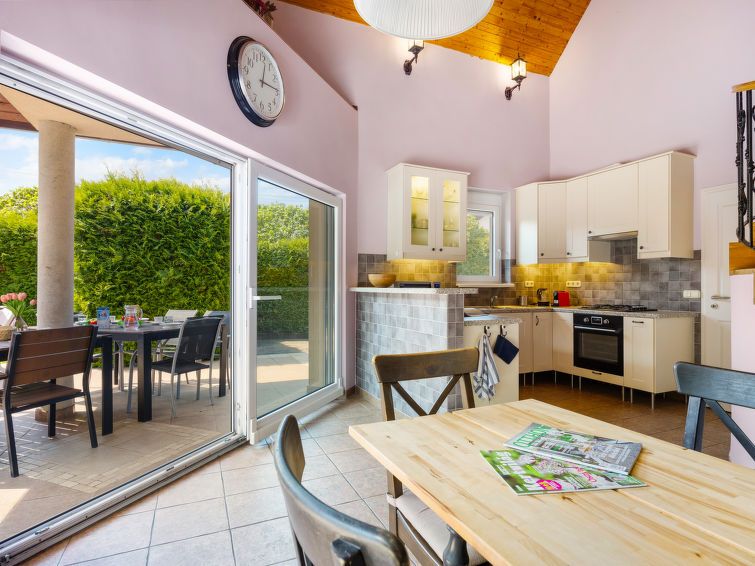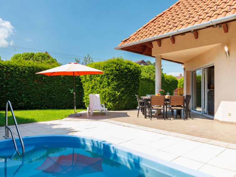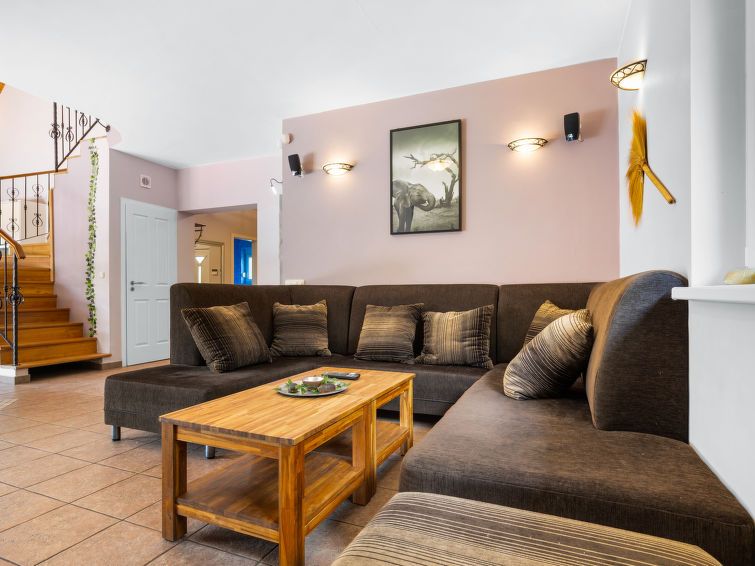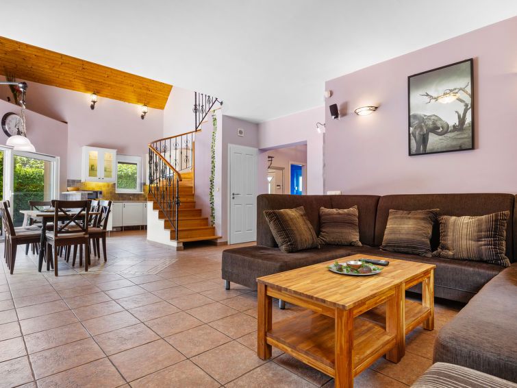 A fantastic house with four separate bedrooms, a living room, a kitchen, two bathrooms, a large terrace, and a small swimming pool. Parking is available on the property and there's plenty of greenery. Perfect for eight people. It's a bit far from the center, which is a drawback for some, but a plus for others. The beach is a 10-minute walk away.