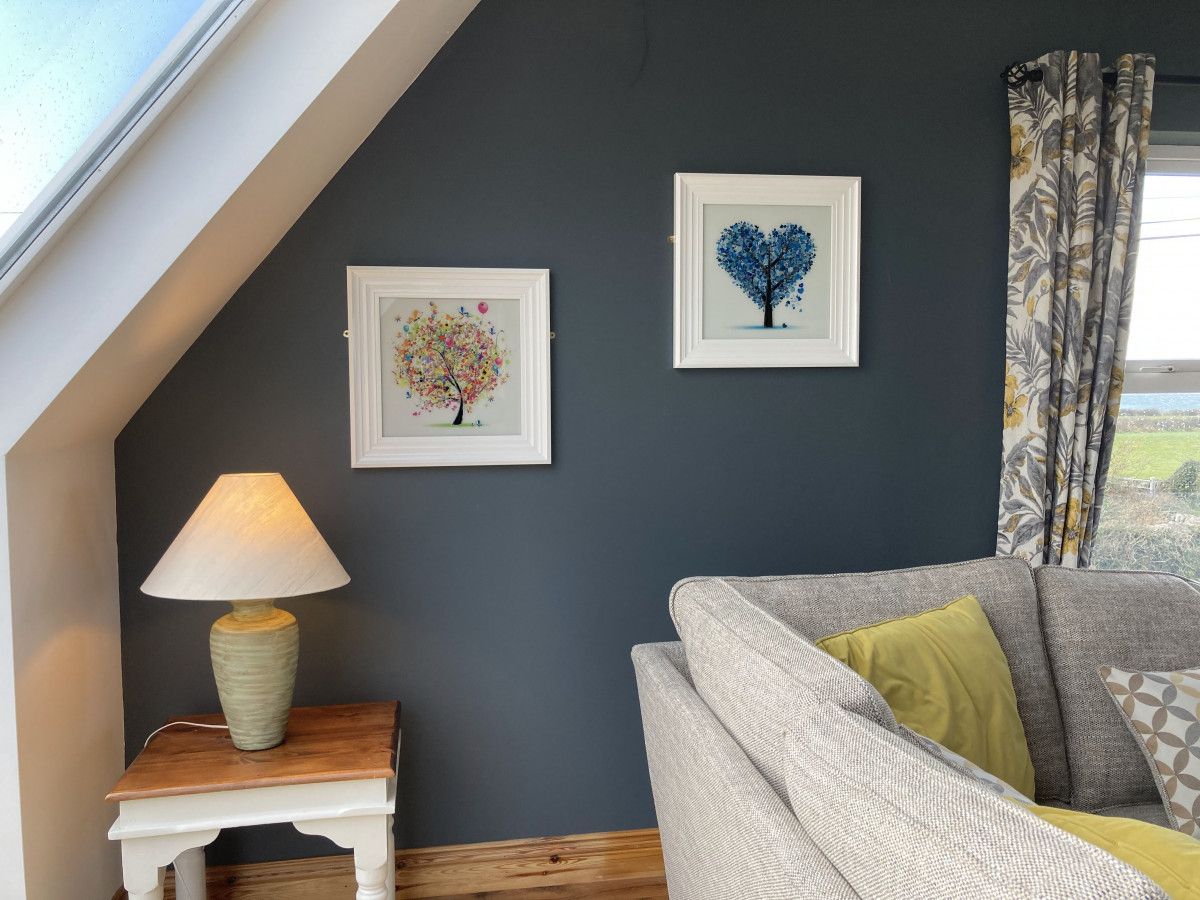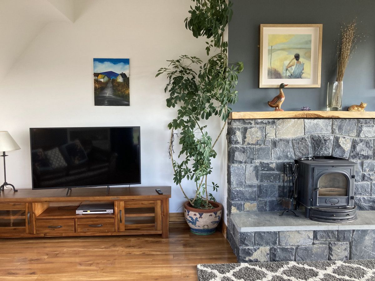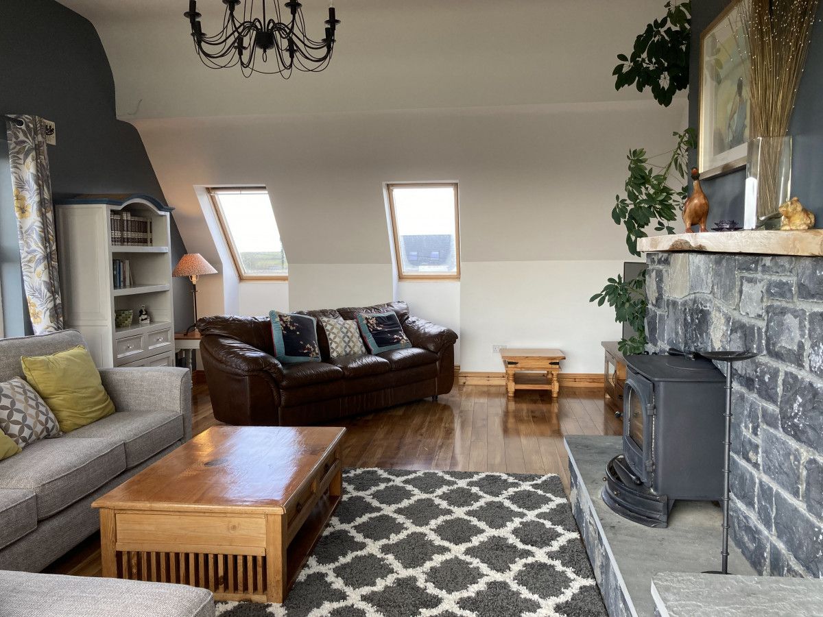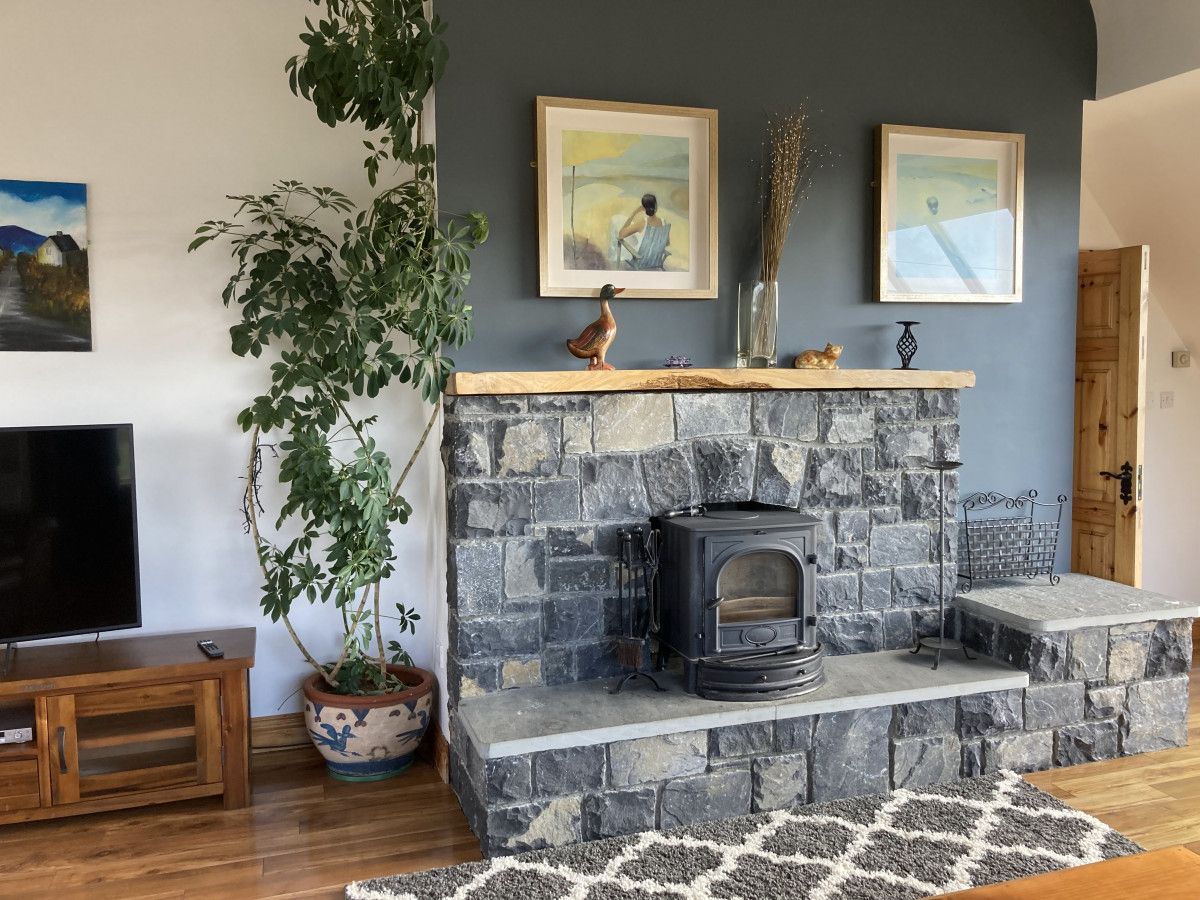 One has a full ensuite and the other has a small washroom with sink and toilet. The next level which is again built on concrete floors for safety and noise reduction boasts an extra spacious living room with cut stone fireplace and a very large panoramic window with views of the Burren hills. Sun light is a large feature in this room and is a great place to relax with a glass of wine and browse through some of the many books that are provided.