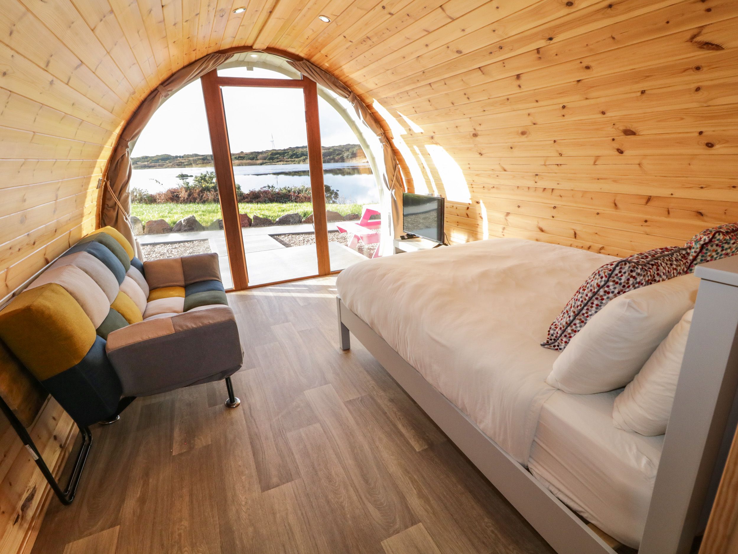 Accomodation Details Single-storey. Studio-style layout with double bed, kitchen, and sitting area with sofa bed. Shower room with walk-in shower, basin, and WC