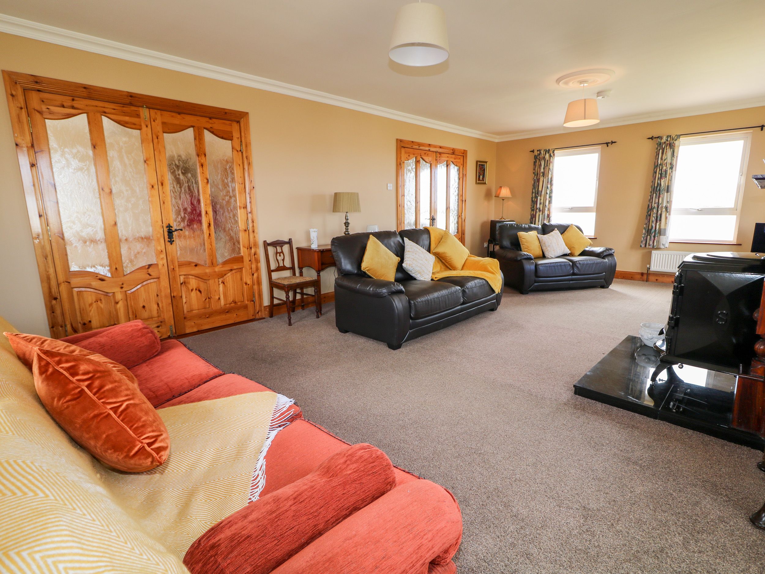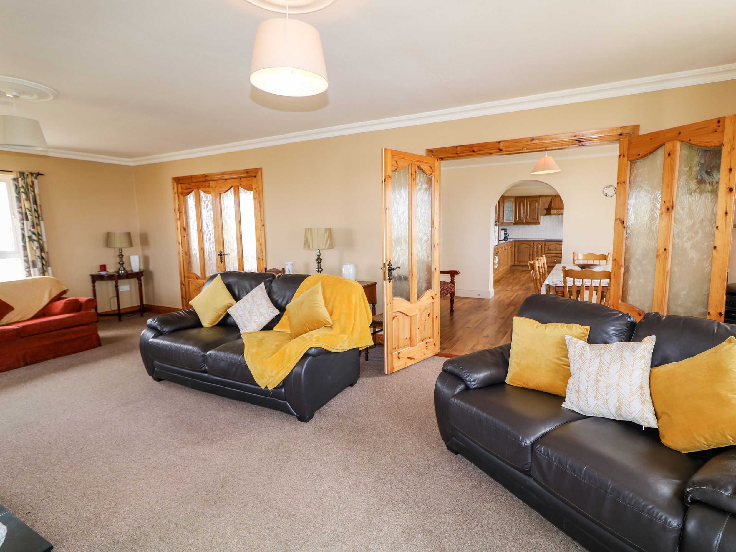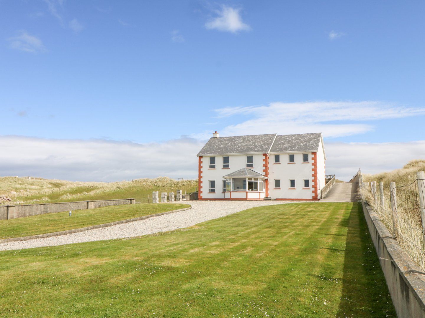 Realt na Farraige is a detached, reverse-level house resting in Derrybeg in County Donegal. Hosting four bedrooms; a ground-floor king-size with en-suite shower, a king-size, a ground-floor twin with en-suite shower, and a ground-floor family room with king-size and single bed, along with a bathroom and a cloakroom, this property can sleep up to nine guests. The first floor houses a kitchen, a dining room and a sitting room. To the outside, there is a front lawn, whilst ample off-road parking is available. Realt na Farraige is a gorgeous holiday home for a seaside resort in County Donegal. Please note: This property accepts bookings of 7 nights or more with arrivals on Saturdays only.