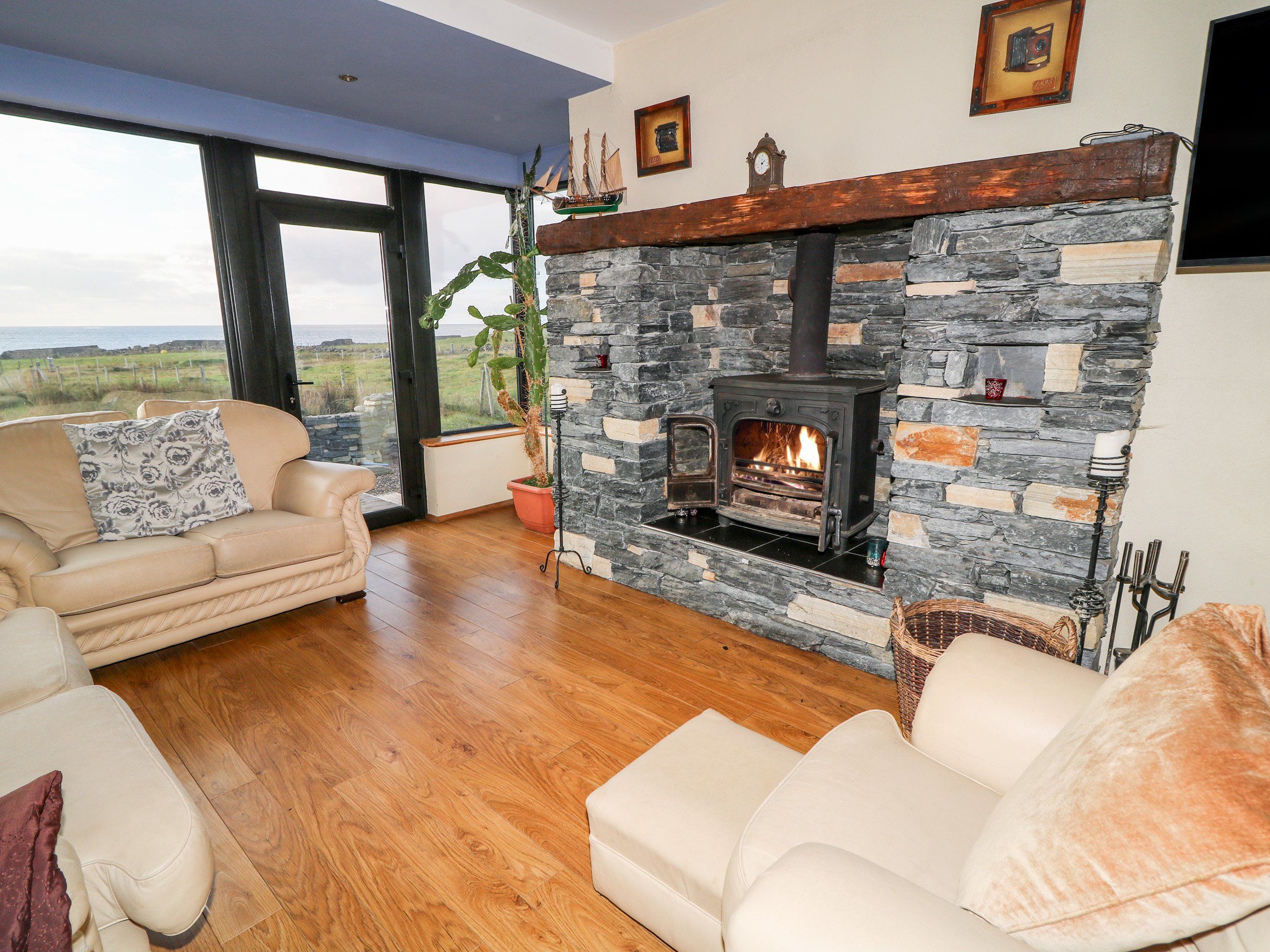 Accomodation Details This property has won the Gold award for best property in Ireland. Three bedrooms: 1 x king-size with feature free-standing bath. Small bathroom with basin and WC, 1 x ground-floor family room with double and two single beds, 1 x ground-floor king-size. Ground-floor wet room with shower, basin and WC. Open-plan living space with kitchen, dining area and sitting area and woodburning stove. First-floor sitting area with balcony and electric fire.