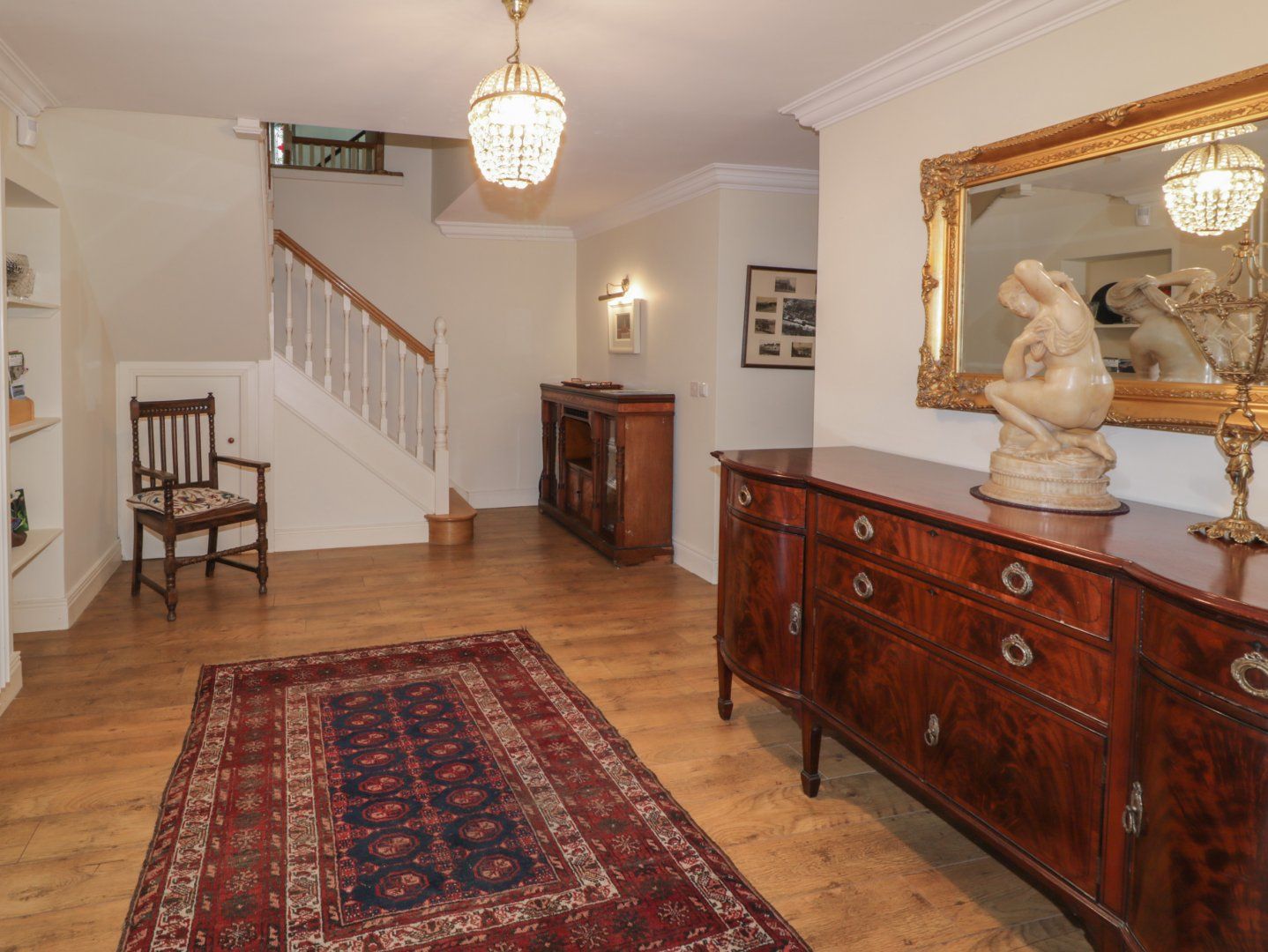 Over three floors. Three bedrooms: 1 x ground-floor king-size with Sky TV, 1 x second-floor king-size, 1 x second-floor twin. Second-floor bathroom with Jacuzzi bath, basin, heated towel rail, and WC. Ground-floor shower room with walk-in shower, basin, and WC. First-floor cloakroom with basin, heated towel rail, and WC. First-floor open-plan living space with kitchen, dining area, and sitting area with balcony. Utility. First-floor dining room with woodburning stove. Sitting room with open fire