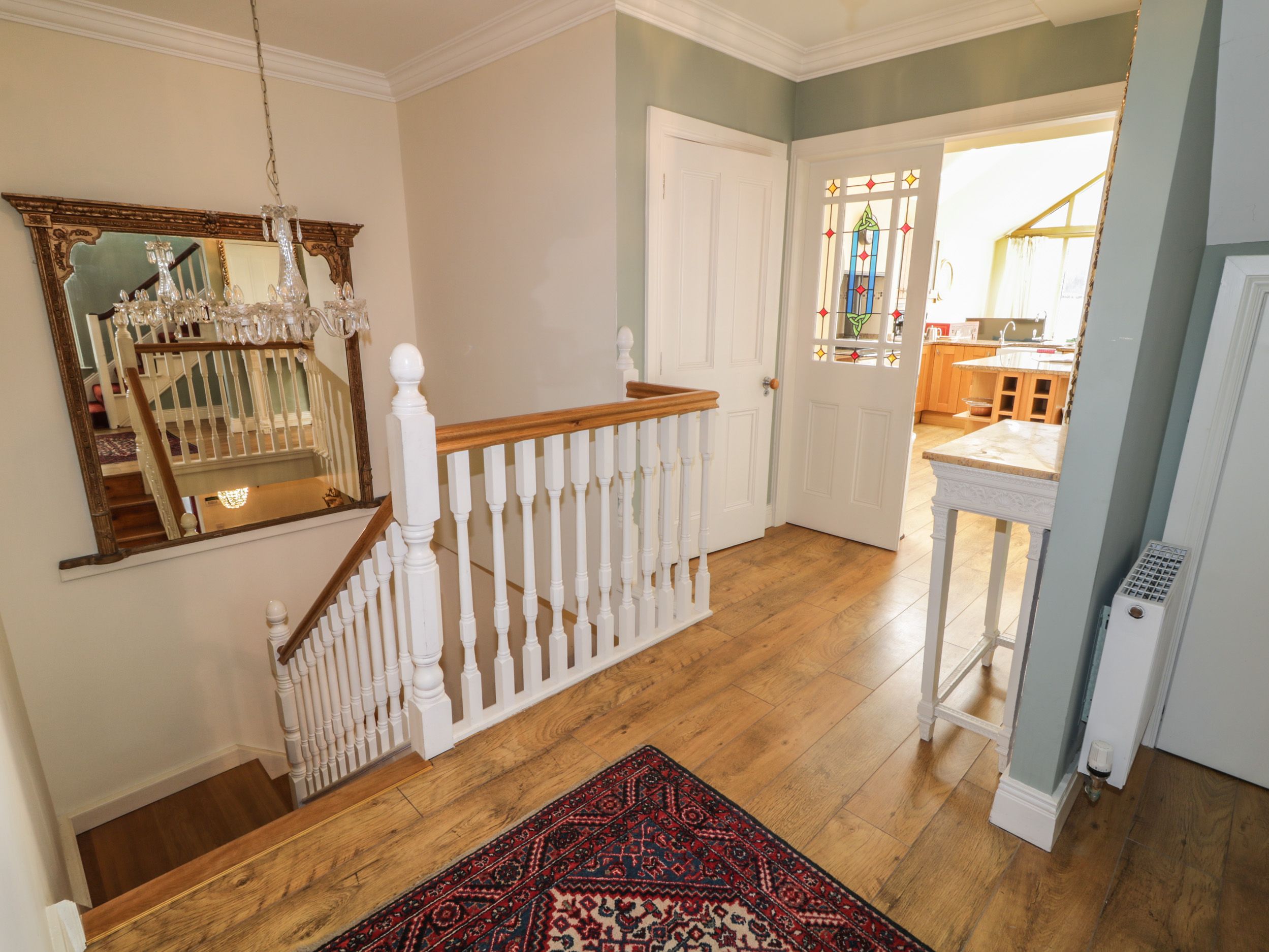 Oil central heating. AGA, microwave, fridge/freezer, washing machine, tumble dryer, safe. TV with Sky, TV, WiFi, selection of books. Fuel, power, and starter pack for woodburning stove inc. in rent. Bed linen and towels inc. in rent. Highchair, travel cot and stairgate available. Ample roadside parking. Rear patio with furniture; balcony with furniture, and barbecue; multi-level garden with lawn, patio and furniture. One well-behaved dog welcome. Sorry, no smoking. Shop, pub and the coast 0.1 miles. Note: There are steps to the exterior and across the gardens. Note: There are two put up beds for extra flexibility Please note: That this property accepts a minimum stay of 4 nights. Please note: The Garden house can an optional extra for larger parties. It consists of a large upstairs sitting room with views onto the garden, a kitchen/dining room and a double bedroom ensuite for €140.00. (The owners occasionally have family staying in this outhouse and the access is via the side door in the courtyard).