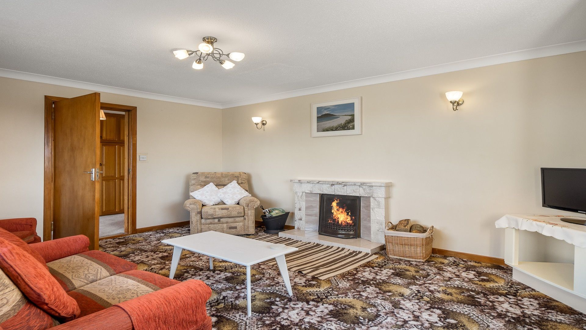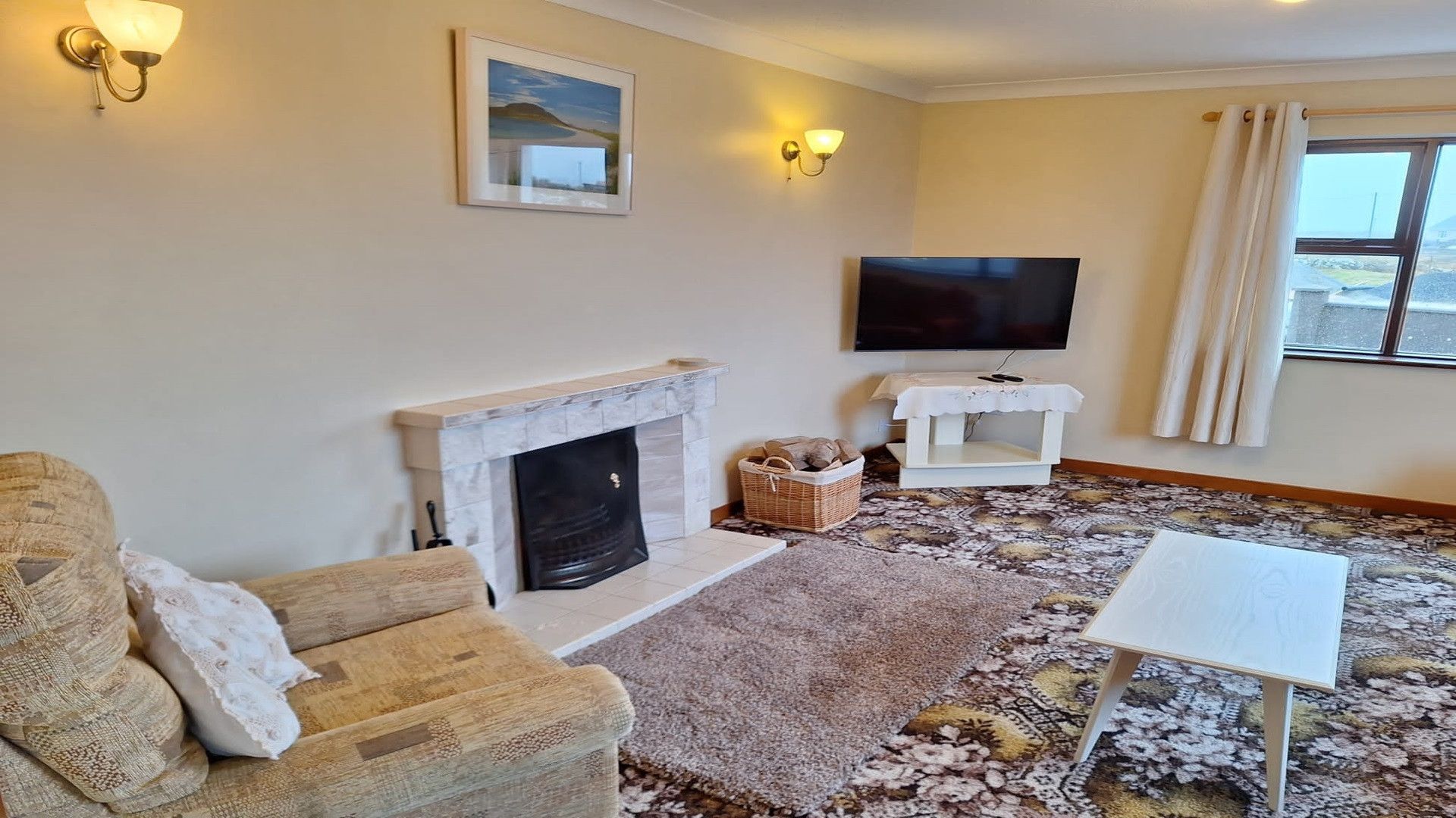 Living room with open fire, Smart TV (Netflix & Youtube) with standard Saorview channels. Two seater couch and 3 armchairs.