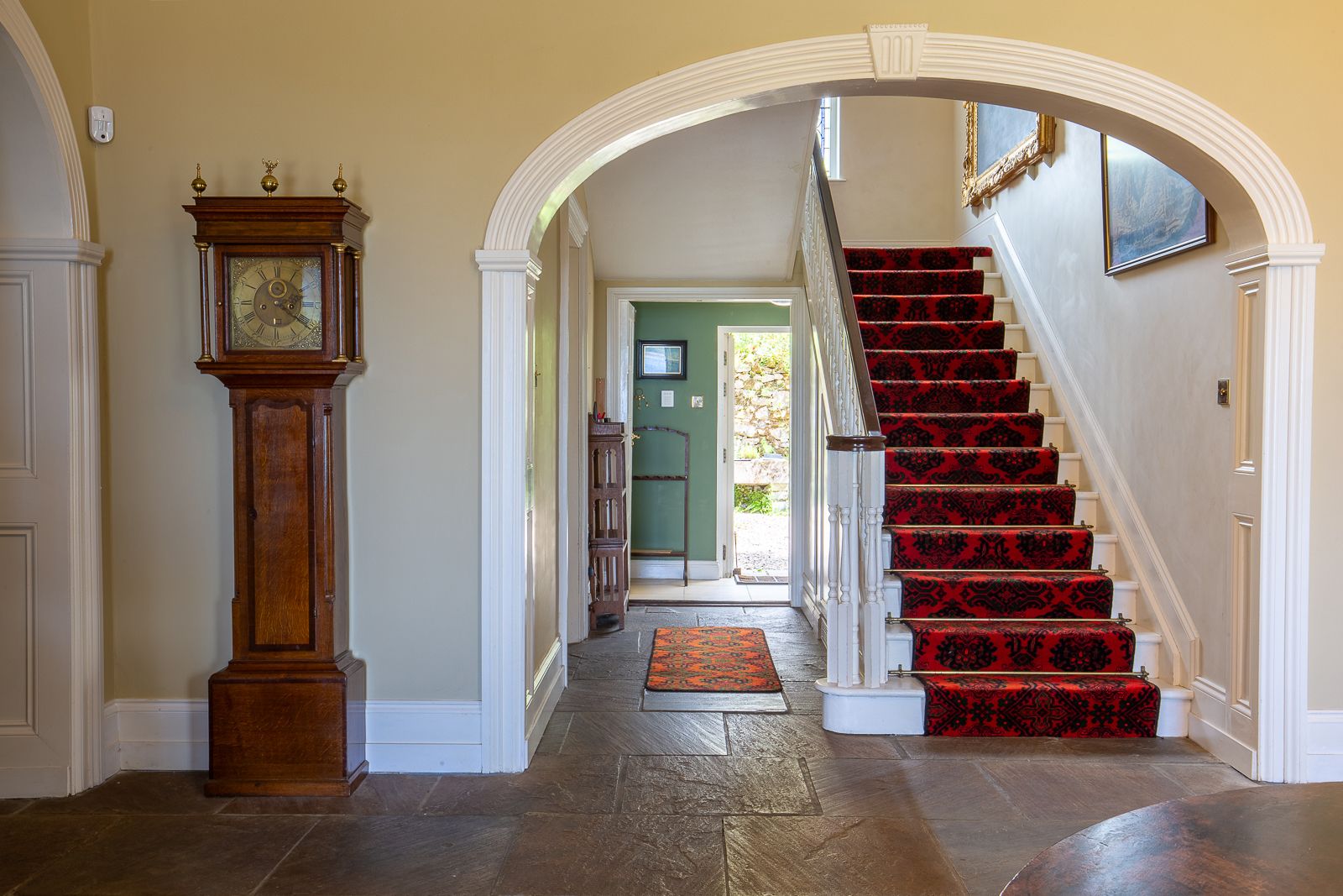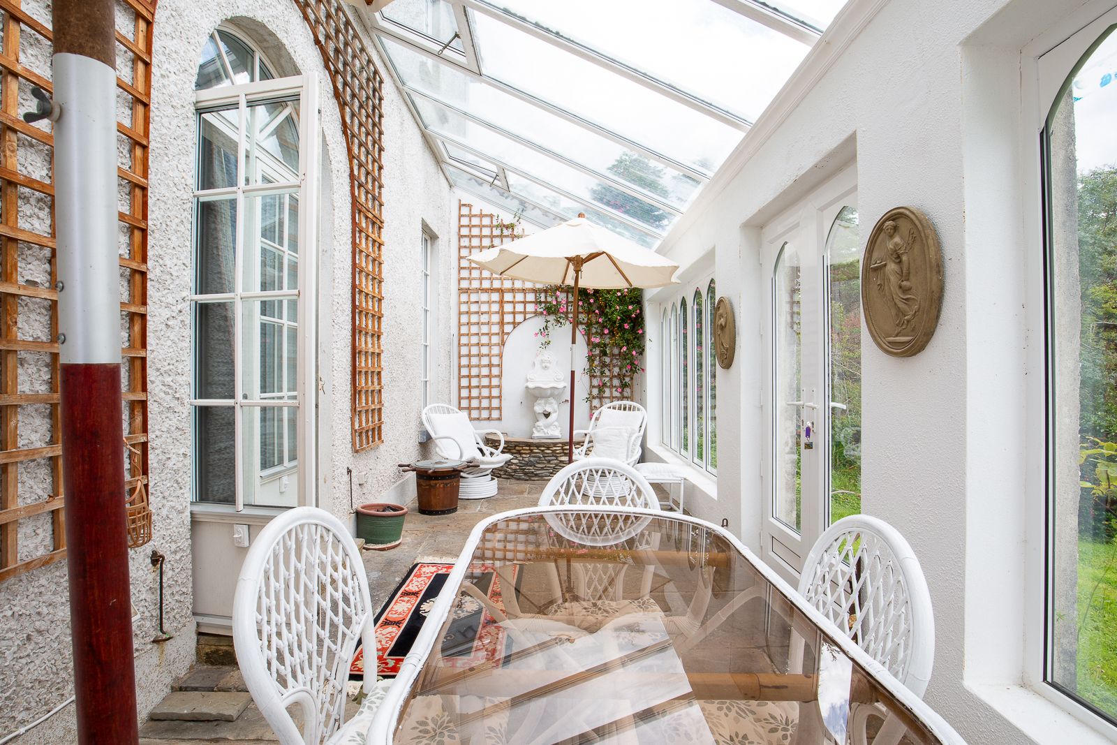 The main house has four elegantly furnished, spacious reception rooms. The hall features a solid-fuel stove and opens onto a sheltered terrace with garden furniture, offering stunning views of the sea. The drawing room, with an open fireplace and several seating areas, leads to a bright conservatory. The library has comfortable sofas, TV and a large selection of books. There is a separate kitchen, a pantry for household chores, and a cloakroom. Upstairs, there are five large double bedrooms and three bathrooms.