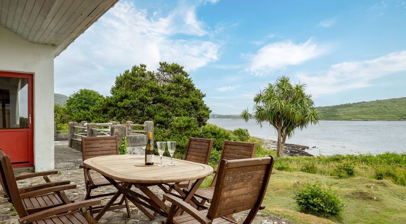 Kitchen/dining area with seating for 8 and views across the bay. High ceilings and large French doors create a sense of light and space. An open fire and comfortable chairs mean you can relax in a cosy, friendly space. Access to the terrace, through the French windows, leads you to the spectacular shoreline.