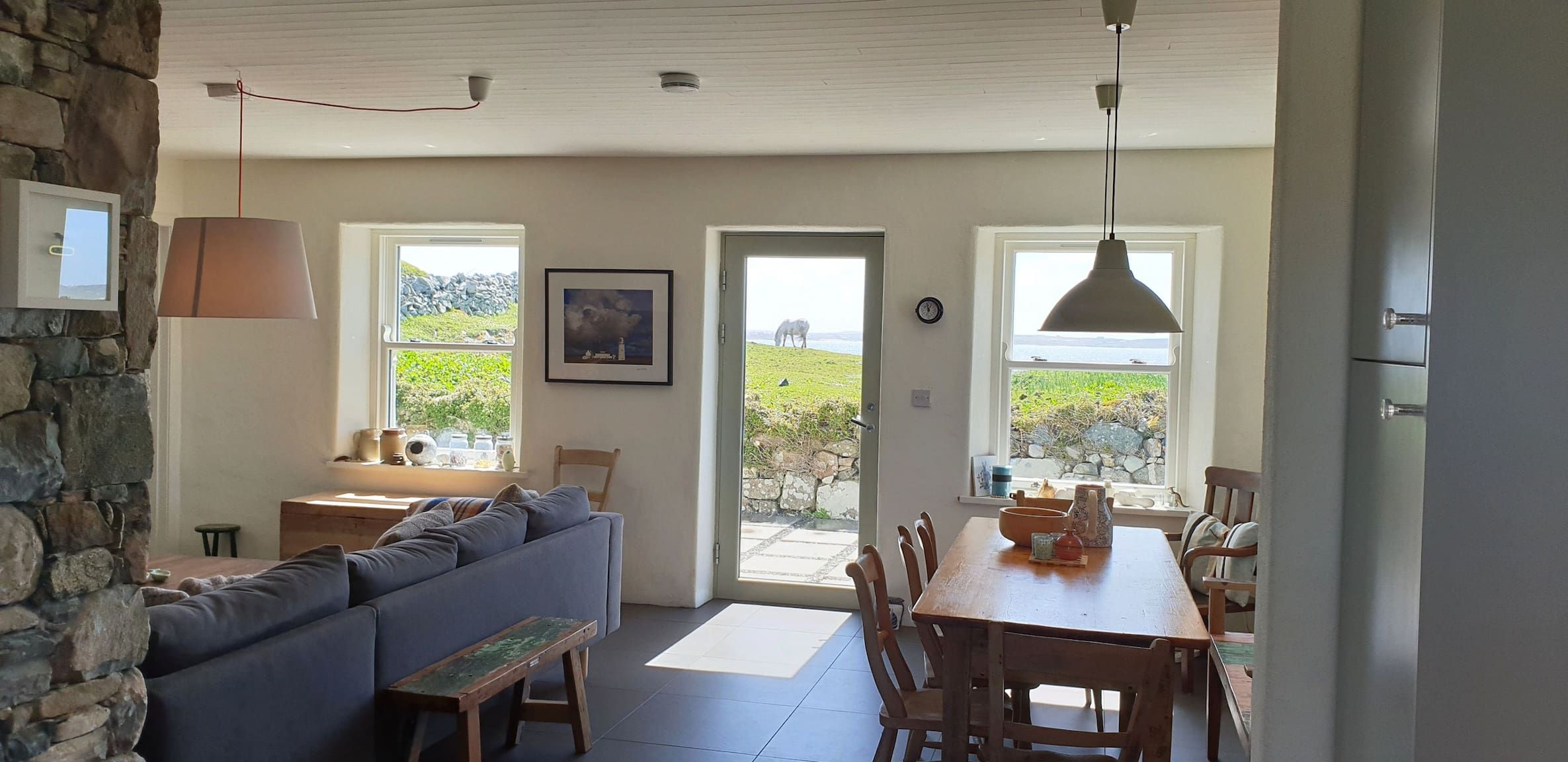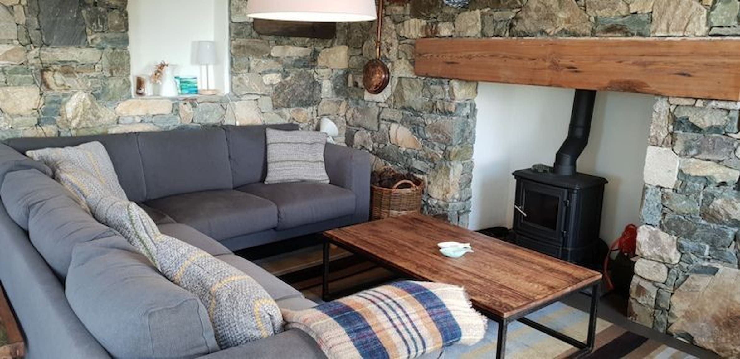 Step into a light-filled haven where natural stone, white-washed walls, and wooden panelling create a calming and contemporary feel. The heart of the home is an inviting open-plan living area with a large L-shaped couch and a wood-burning stove – perfect for cosy winter evenings. Throw open the patio doors in summer to dine al fresco as you gaze across the Atlantic and watch the occasional Connemara pony wander by.