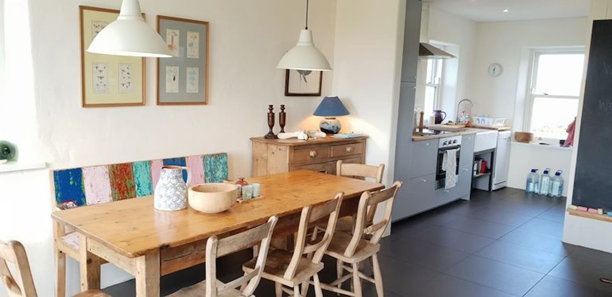 The well-equipped kitchen features a Belfast sink, slimline dishwasher, fridge-freezer, coffee machine and everything you need to whip up a delicious meal – all with stunning sea views. Gather around the large dining table that seats 8 with ease, or head to the patio for seaside suppers.