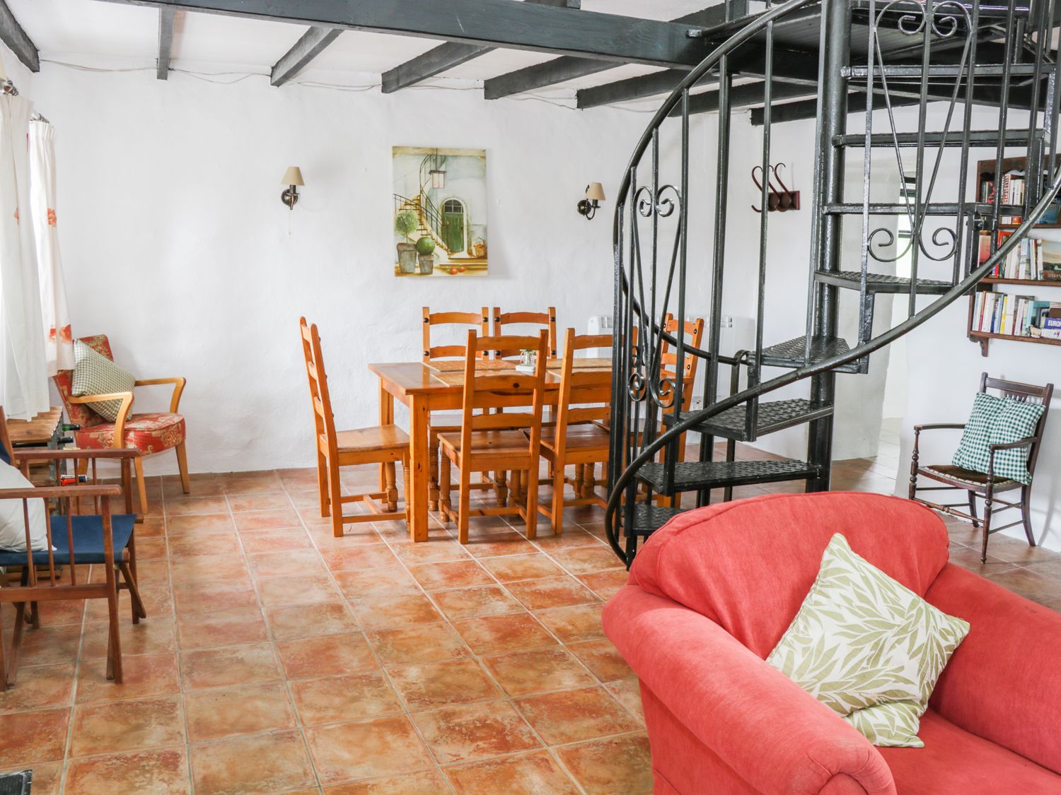 Amenities Electric central heating with woodburning stove. Electric oven and hob, microwave, fridge/freezer, washing machine, TV with Freeview, WiFi, selection of books, games and DVDs. Fuel, power and starter pack for fire inc. in rent. Bed linen and towels inc. in rent. Travel cot and highchair. Off-road parking for 4 or 5 cars. Lawned garden to the front and side. Sorry, no pets and no smoking. Shop and pub mins walk. Note: Spiral open-tread staircase leading up to the first floor mezzanine area, children to be supervised. Note: Walkway at mezzanine level contains low ceilings, care to be taken.