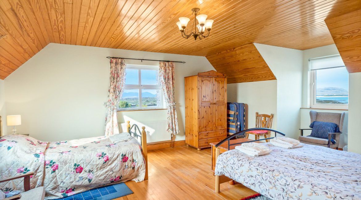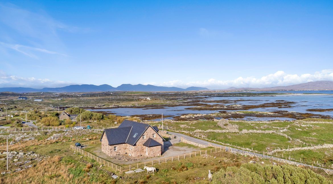 Outside: Spacious stone faced house in exceptional location beside the sea. It is located in a small hamlet near the end of the road and close to the 27-hole championship golf links course at Ballyconneely. The sea is just a minutes walk from the door, where you can bring your morning coffee out, sit on a rock and enjoy the sound of the sea. You are just a short drive away from numerous sandy beaches – Dunloughan, Mannin, Coral strand to name a few.