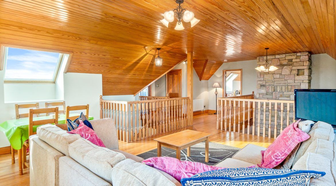 Upstairs there is a large “chill out” space with a further TV. This is the perfect area for the kids to take over with more seating and a dining table to use. There is also plenty of space for an extra fold out bed to be set – available on request. You will also find 2 further rooms – a double & a double with single. Both rooms are ensuite with showers.