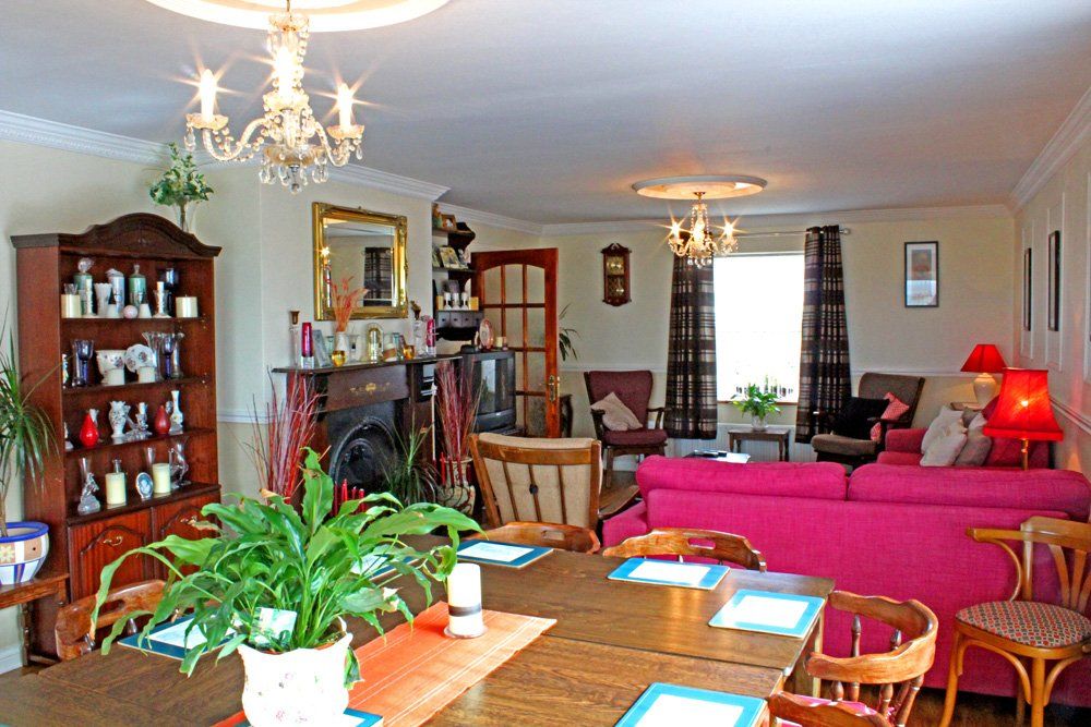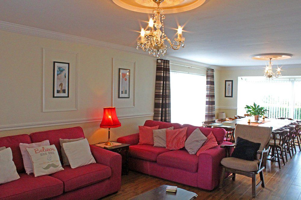 Inside: As you walk in there is a hallway space, table with numerous leaflets for attractions in the area. There is a stair case to the right and doors to the left. If you go through door to left it is the dining room with fire place, sofas and dining table and chairs. You can walk through to the kitchen which has dining table and chairs. Kitchen is well equipped. Of the kitchen is the back door with utility area with washing machine and dryer. You can go through from kitchen to sitting room which has open fire place and TV, loads sofas and big glass area which is like sunroom in the sitting room. It is lovely, bright and warm. Coming back in to the entrance hallway you carry on down the hall and there are 4 double ensuite bedrooms. All bedrooms have good linen, bedside lockers and lamps, nice wardrobes and flat screen TVs. Going back and then up the stairs there are another 4 bedrooms,3 of these bedrooms are double and a single and one bedroom is double and 2 singles. All bedrooms have good linen, bedside lockers and lamps, nice wardrobes and flat screen TVs.