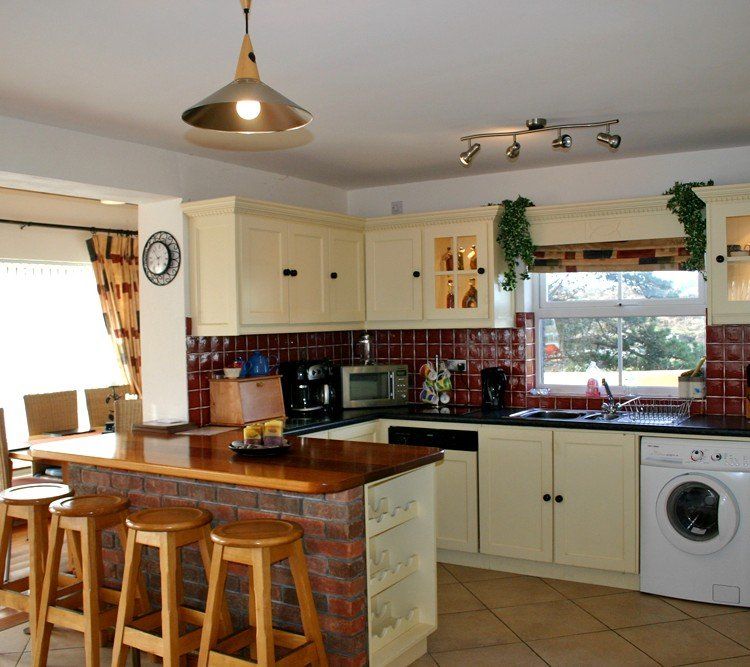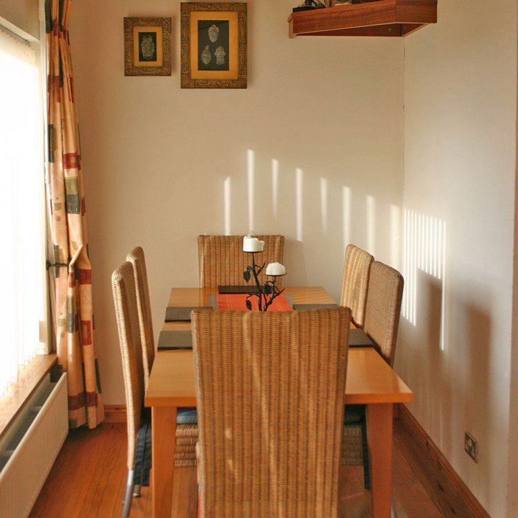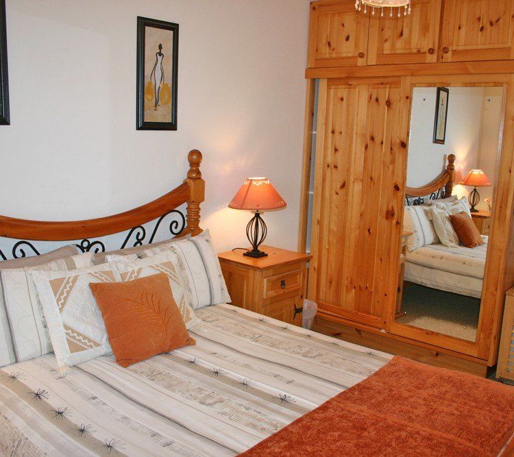 Inside: As you walk in there is a hallway and you can go straight through to open plan sitting room/dining/kitchen and sun room area. Sitting area has couch and chairs,TV and gas fire. Kitchen is like a cream colour and is fabulous with all mod cons like a dishwasher, coffee maker and 2 ovens. There is a dining area to the left and to the right are sun chairs/couches. This area is all glass and is looking out over the garden and on to the lake. There are double doors and a patio area where you could sit out.Going back to the hallway there is a spiral staircase and off this is a bathroom with bath and shower. Going back up the hallway there are 2 double bedrooms. Both bedrooms furnished extremely well with wooden wardrobes with glass doors, fancy big lamps and bedside lockers. Good linen and throws on the beds. Up the spiral stair case is a room with 2 singles and is only suitable for children due to the low ceilings and also a double ensuite bedroom furnished to a high standard.