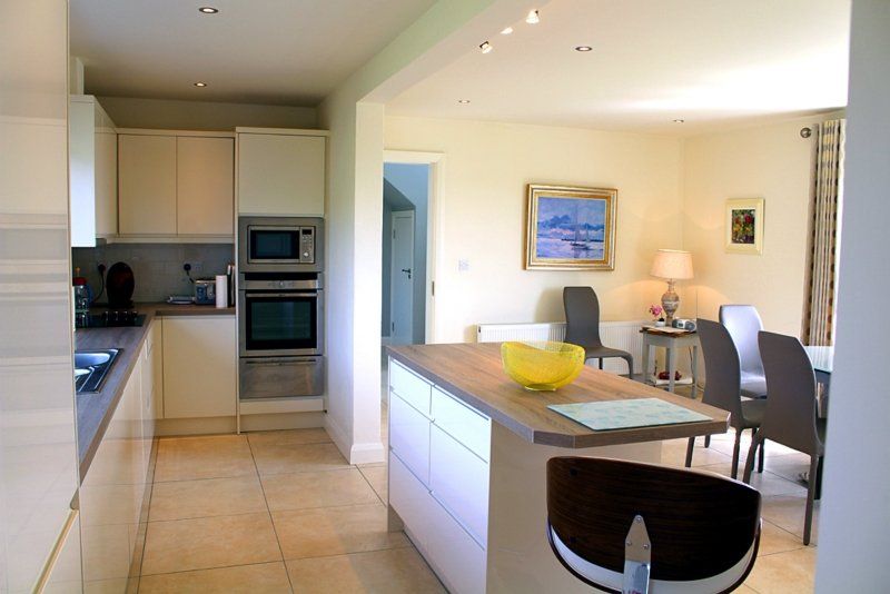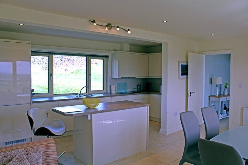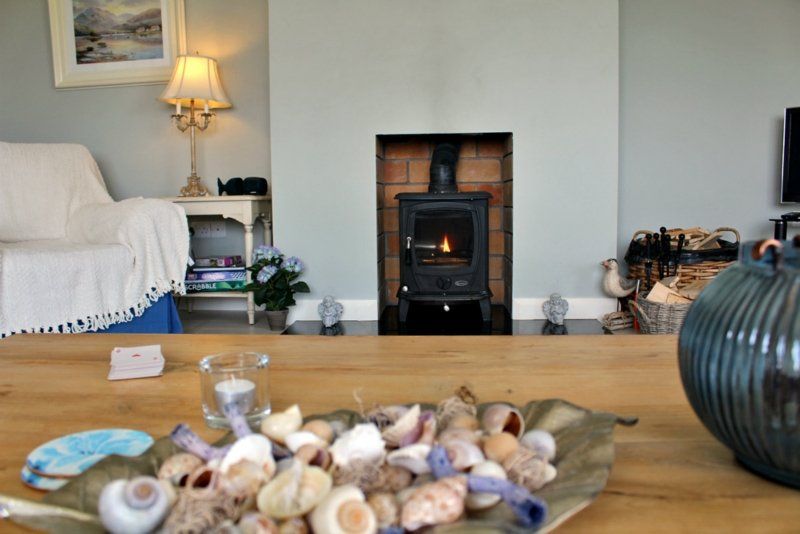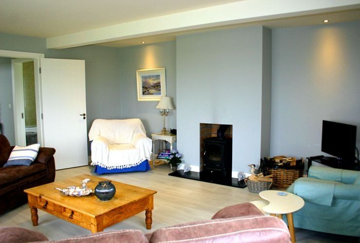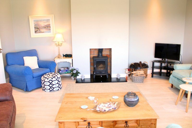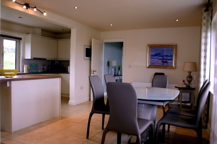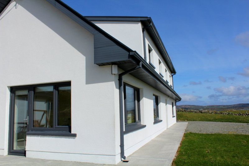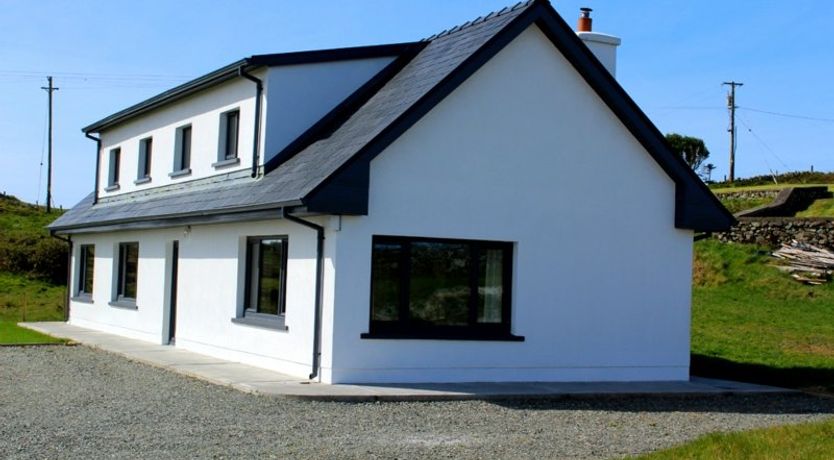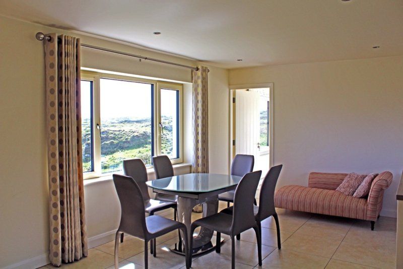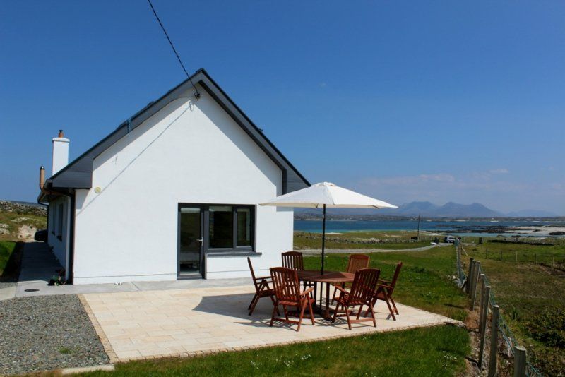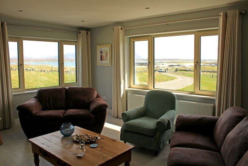 Inside: Fine entrance gates and long gravel driveway up to the property. There is a patio area to the side of the property with a swing chair. As you walk in the front door there is an interesting stair case to your right. In to the left is a big open plan dining/ Kitchen area. Kitchen is fully equipped with all mod cons and is very stylish. Off the kitchen there is a double ensuite bedroom with big windows and a door leading out to the patio area. Of the kitchen is also a back door. Back in to hallway area there is a main bathroom with shower over bath and further on is a big living room space. There are big windows with stunning sea views over Mannin Bay. The sitting room has big cosy couches, wood burning stove and a flat screen T.V.Upstairs there is a double and single bedroom with sea views. Landing area with a couch. Further on is a Double and a double ensuite bedroom. Both double bedrooms have sea views. All bedrooms have sliding wardrobes with mirrors and house is furnished to a high standard. Lovely crisp colours and like a lighthouse theme throughout the house.