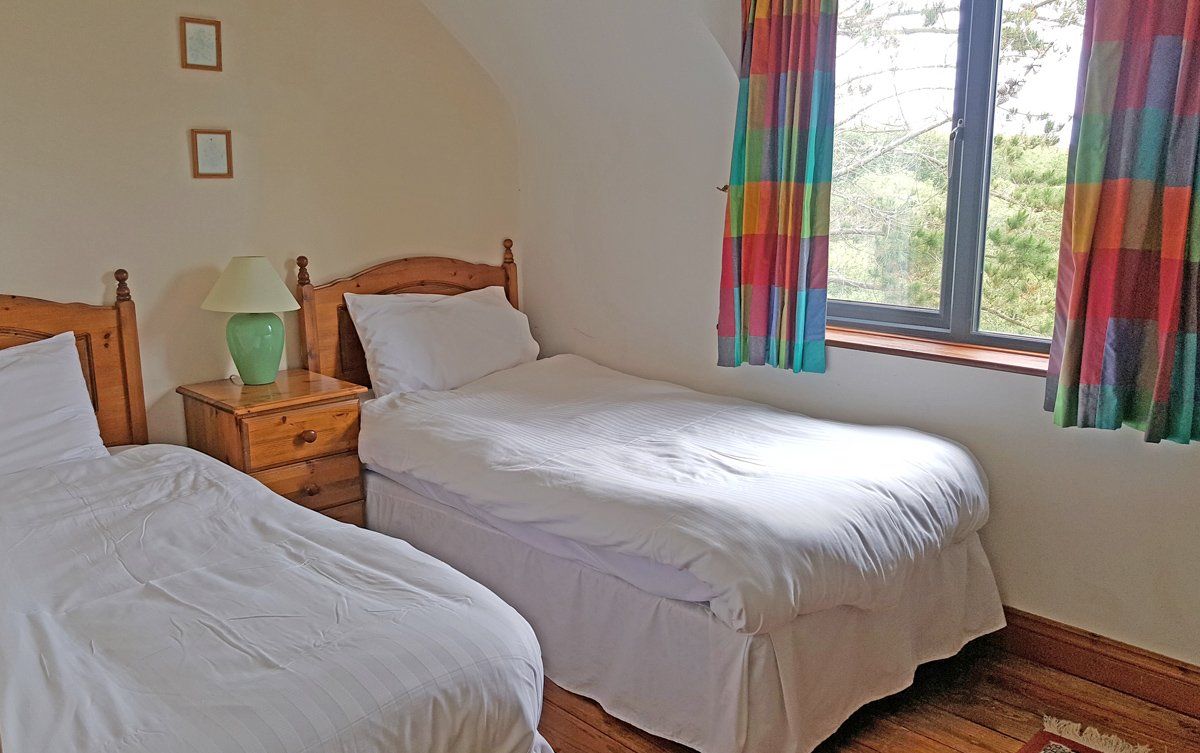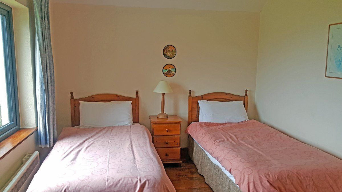 You enter into a large open plan room with Sitting room, Dining area & Kitchen. There are 2 sofas in the sitting area (1 is a sofa bed) & a newly instated turf burning stove – You will be given a bin of turf to make you enjoyed the stove. The sittiing room has a large window with beautiful views of the lake & ocean. The kitchen has all modern cons including dishwasher & in the utility room the is a washing machine & dryer & also a freezer. Making it perfect for families.