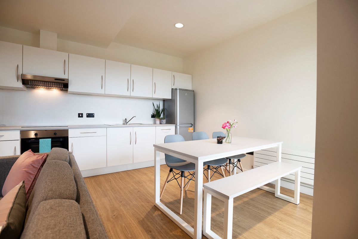 Seating Digital TV Coffee table Either a dining table with chairs or a breakfast bar with high stools Iron and ironing board Electric heating Crockery and cutlery Pots and pans Electric cooker Fridge-freezer Kettle Toaster Microwave