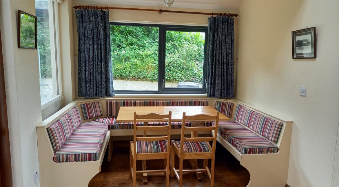 Inside: You enter into a large open plan room with Sitting room, Dining area & Kitchen. There are 2 sofas in the sitting area (1 is a sofa bed) and a newly instated stove. The sitting room has a large window with beautiful views of the lake & ocean. The kitchen has all modern cons including dishwasher & in the utility room the is a washing machine & dryer & also a freezer. Making it perfect for families.