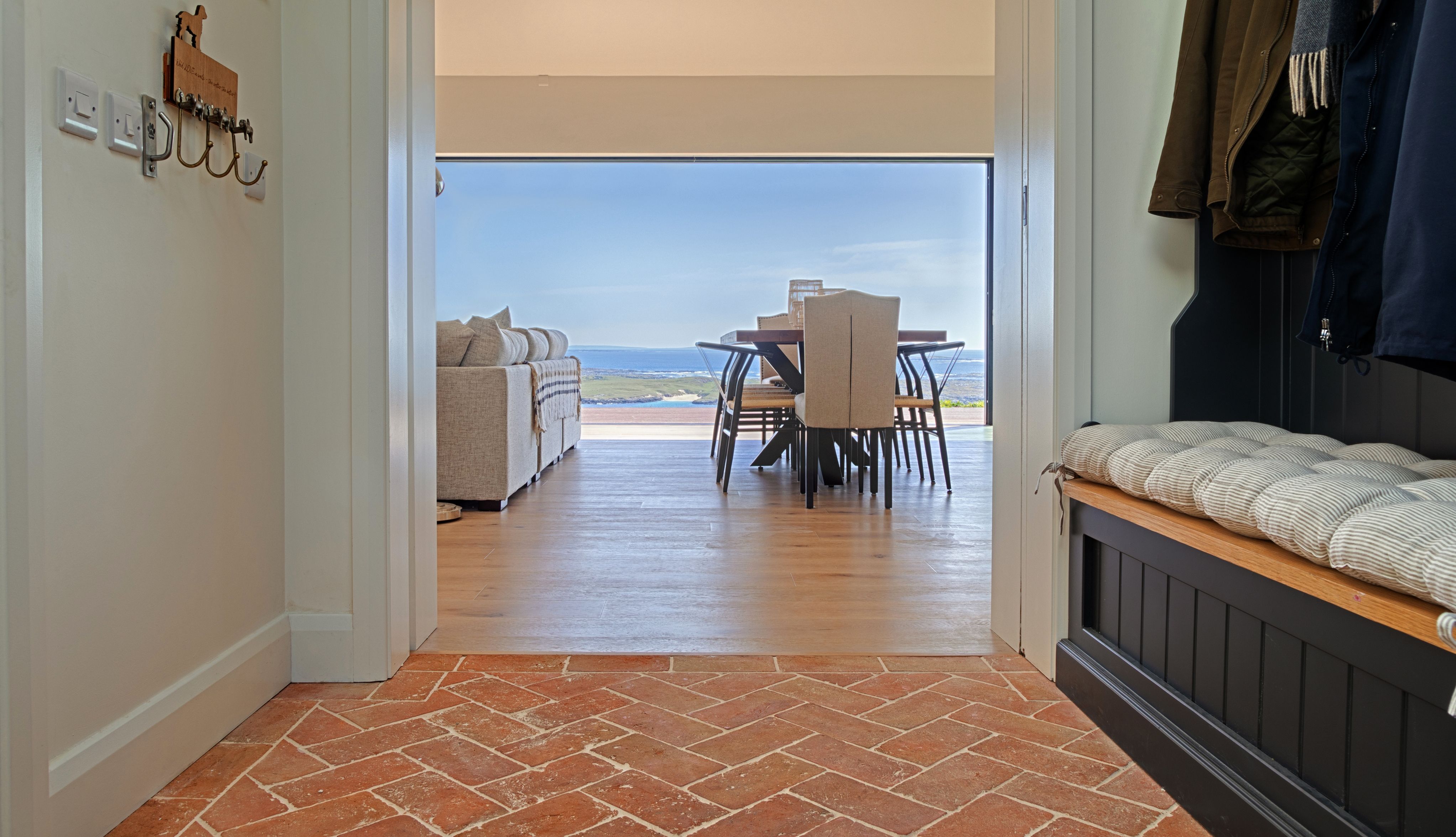 After a day exploring Connemara’s wild mountains, you might rustle up dinner on the Bora hob in the state-of-the-art German kitchen. Then curl up on the generous corner sofa, wrapped around a creamy Bath stone fireplace, and watch a movie on the 75-inch screen with flames flickering.