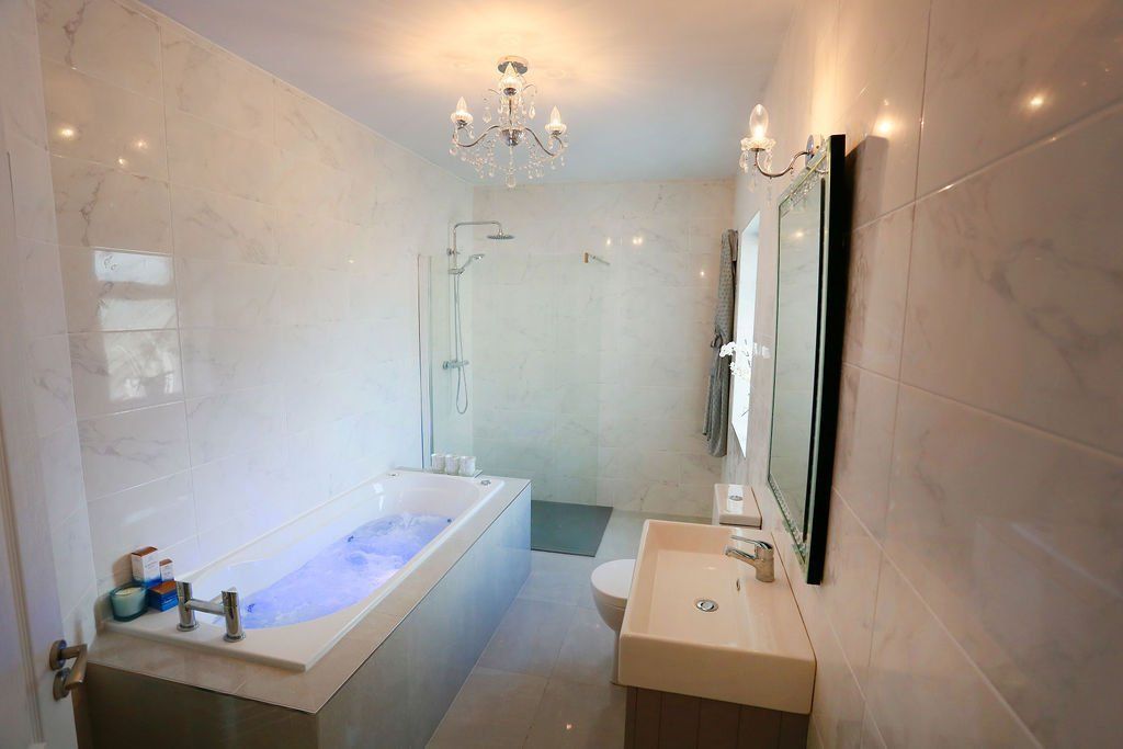 Bathrooms: There are 5 bathrooms in the House: Luxury main bathroom with Wellness Chromatherapy Jacuzzi and wet room shower. 1 main bathroom upstairs, 2 ensuite, 1 Wc. Kitchen, Dinning room: The beautiful modern kitchen is fully equipped with all mod cons, double oven, hob, fridge freezer, microwave oven, dishwasher and a large island unit for entertaining.