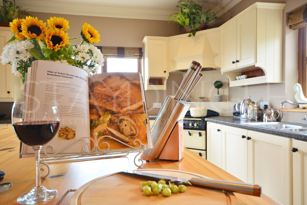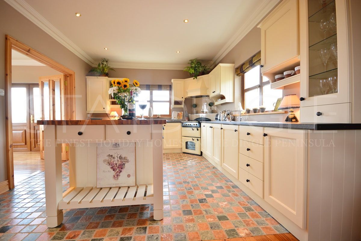 The classic cream country kitchen has a modern touch with a large central island, great amounts of storage, a gas stove, dishwasher, fridge/freezer, microwave, kettle toaster and cafetiere. There are double doors that lead onto a seperate dining area that overlooks the sea. The dining area has a table to seat six with a service side board and french doors leading outside. There is a separate utility off the kitchen/lounge with sink, storage, washing machine and a downstairs toilet.