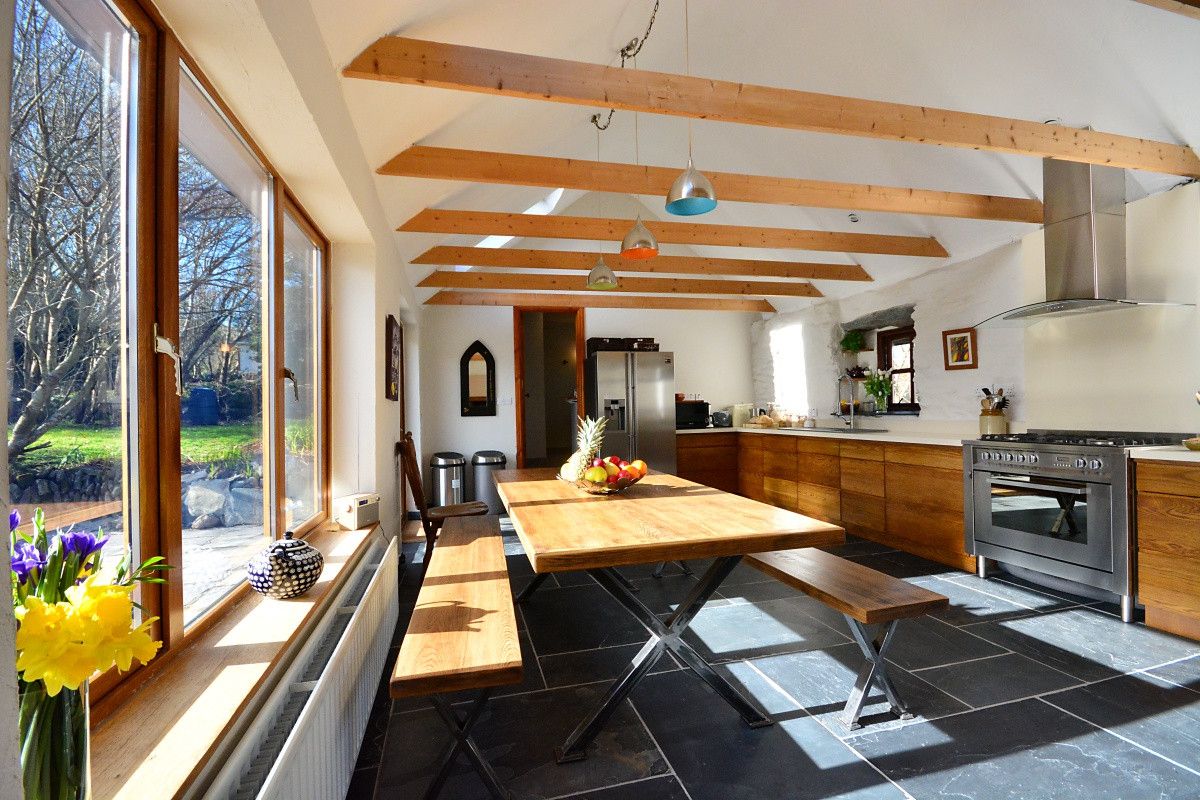 Spacious and bright it boasts vaulted ceilings, two wood burning stoves, vintage furnishing, a modern kitchen and a sunroom that leads out into the patio and established garden.