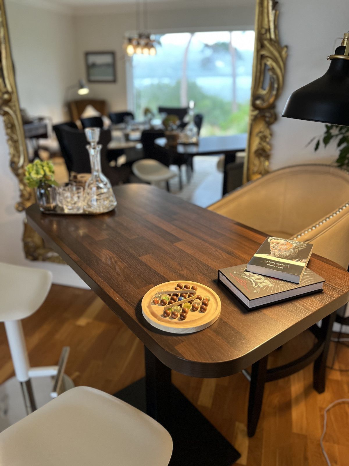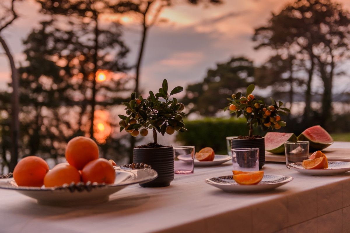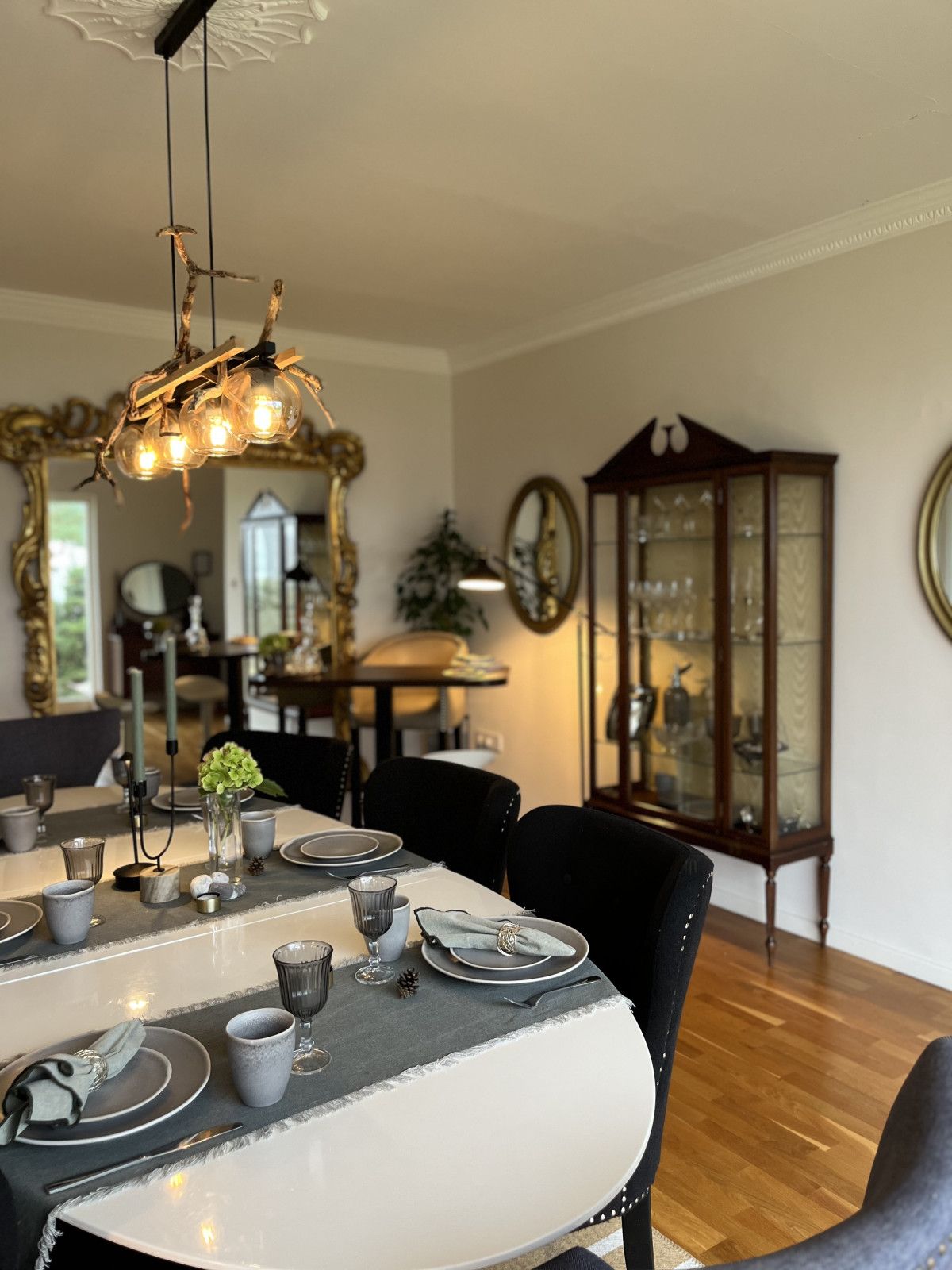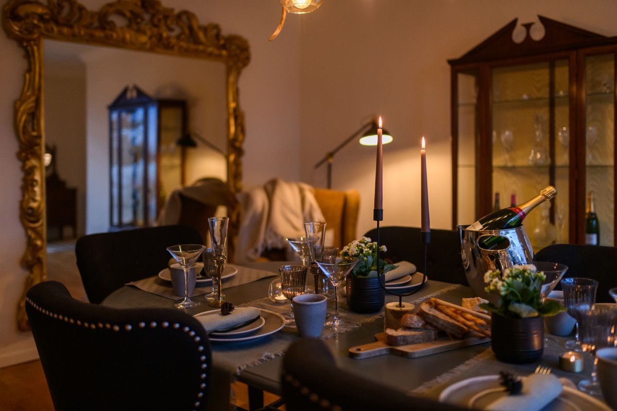 The dining room features large floor-to-ceiling windows and antique furniture - the ideal setting for those long and lazy lunches and magical evening meals with friends.