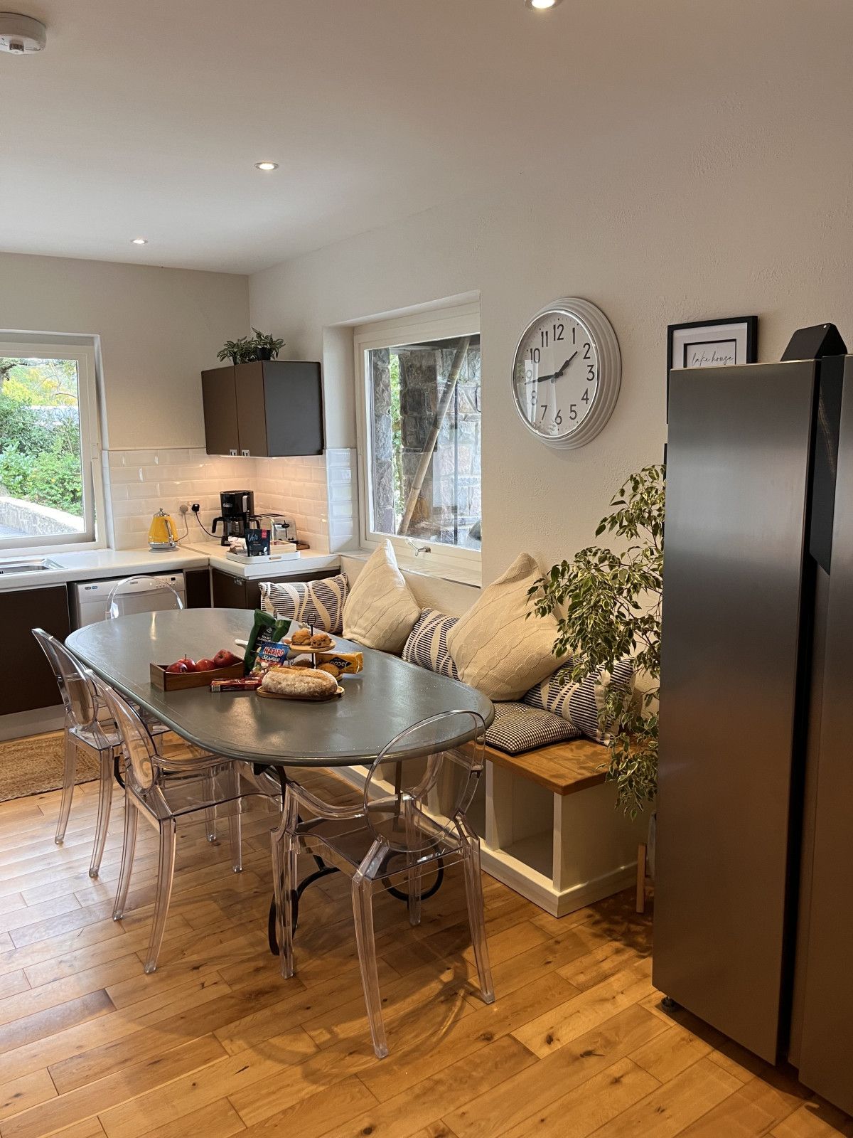 The large kitchen is fully equipped, perfect for preparing those delicious meals - the trout you caught earlier that day or fresh local vegetables you bought in the nearby town. There’s also a long oak bench to lounge on, sip your tea and look out onto the lake.