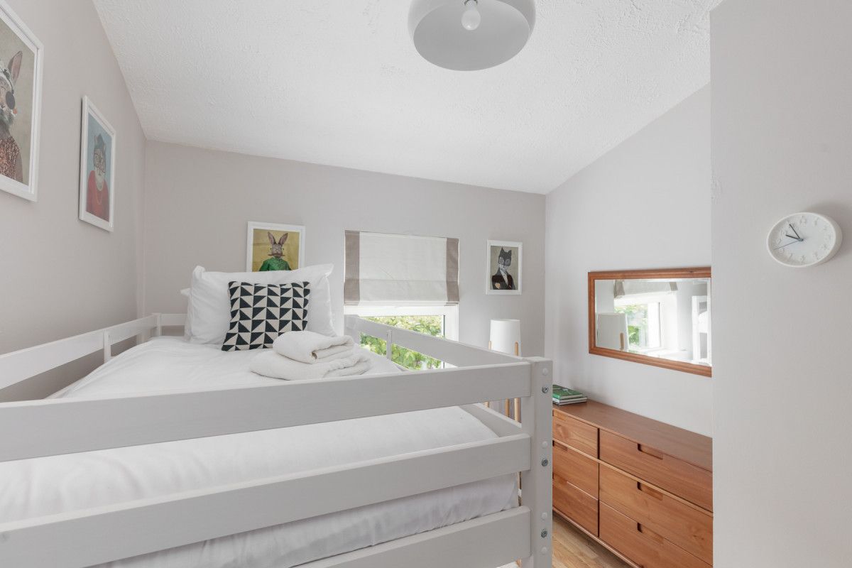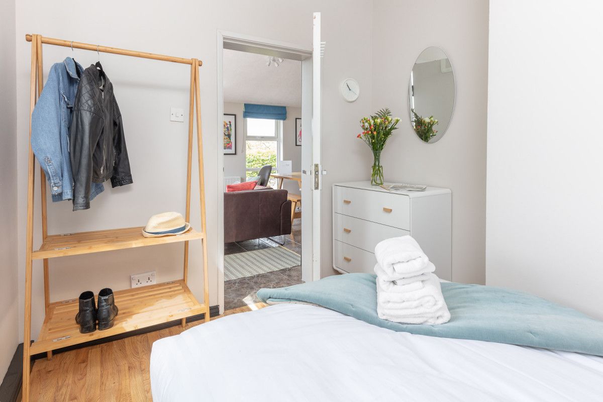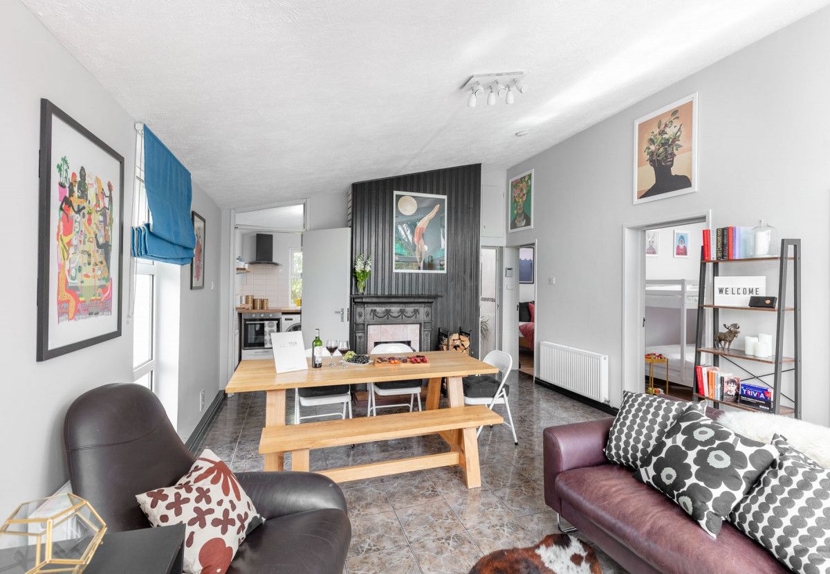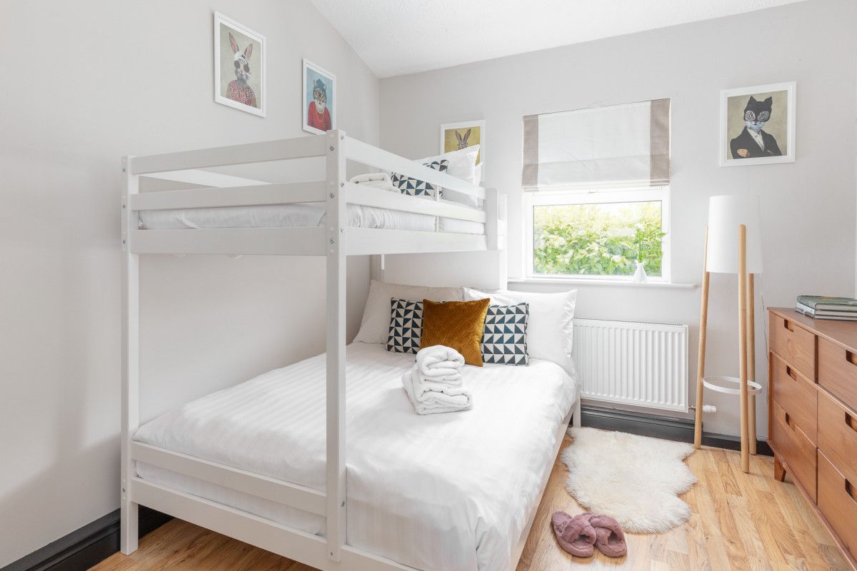 The cosy bedrooms all have wooden floors, stylish contemporary furniture and are equipped with bedside reading lights. A large double bedroom to rear is decorated with stylish drawers and hanging storage, a mirror/vanity and high ceilings. The middle bedroom is kitted out for kids with a bunk bed with a double on the bottom bunk. The front double bedroom has practical and stylish storage with funky retro styled drawers and hanging rail/ case rack, contemporary style and retro travel posters to inspire your next trip!