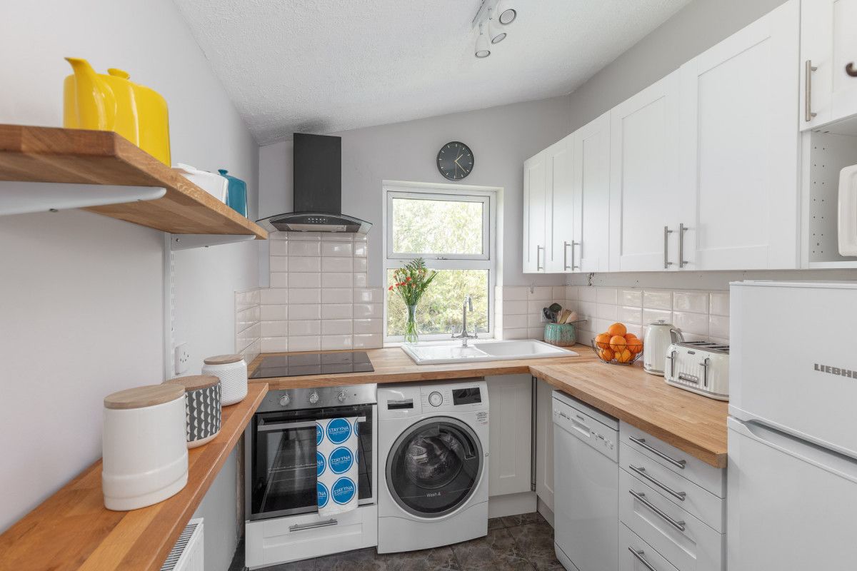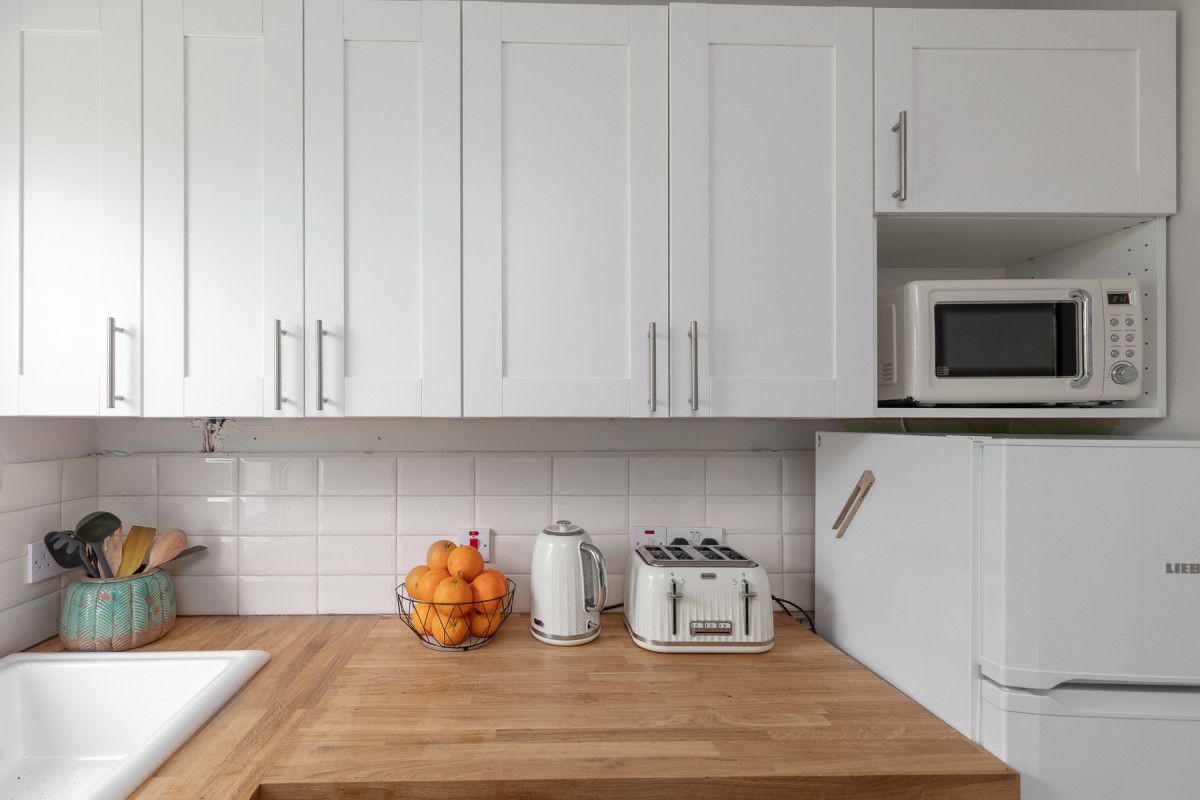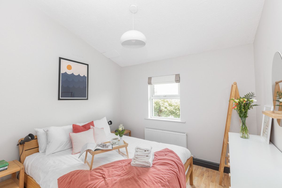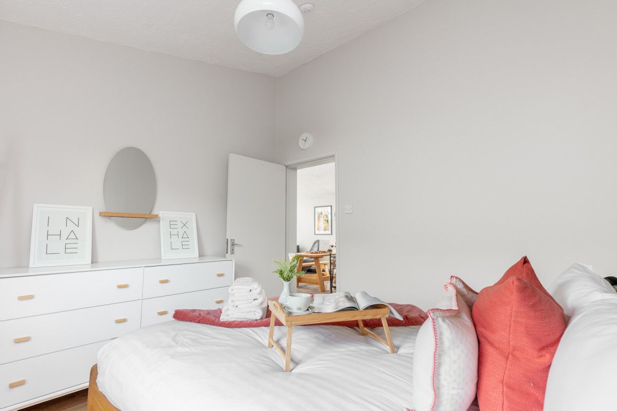 The cosy bedrooms all have wooden floors, stylish contemporary furniture and are equipped with bedside reading lights. A large double bedroom to rear is decorated with stylish drawers and hanging storage, a mirror/vanity and high ceilings. The middle bedroom is kitted out for kids with a bunk bed with a double on the bottom bunk. The front double bedroom has practical and stylish storage with funky retro styled drawers and hanging rail/ case rack, contemporary style and retro travel posters to inspire your next trip!