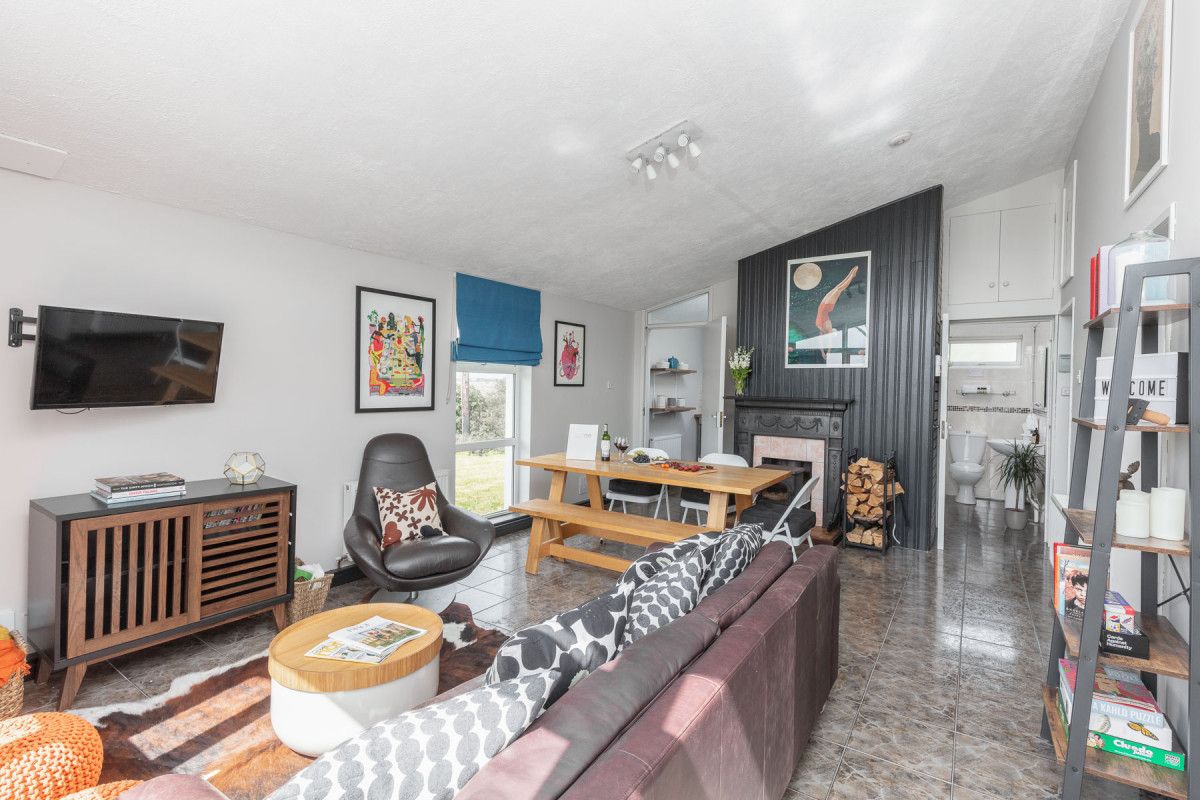 The main living area is a funky and stylish space. It’s a bright and cheerful room filled with light from the large windows. Quirky contemporary art and furnishings give this getaway a fun and lively vibe. Comfort and practicality meet with tiled floors ready for sandy toes, and a squashy leather couch and bucket chair, for cosy evenings in front of the TV, warmed by the stove fire. A large dining table with bench style seating and chairs makes the most of the space.