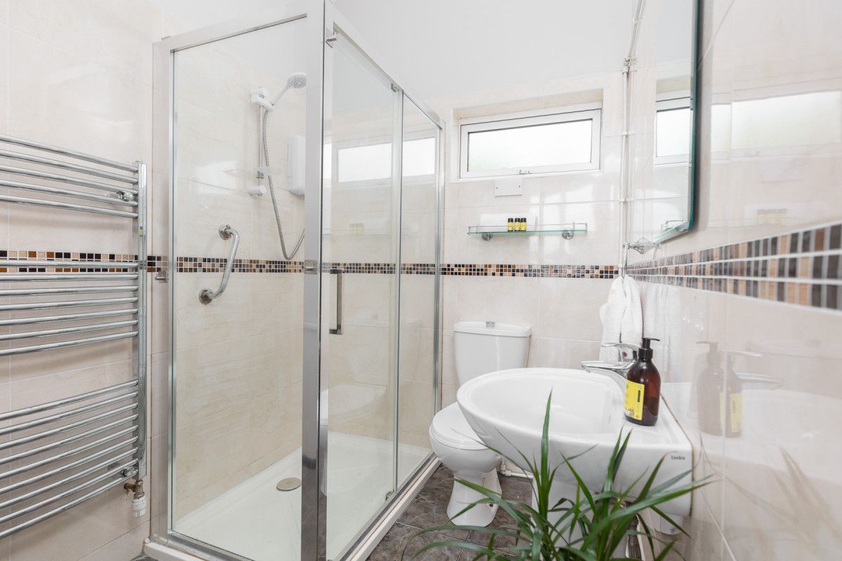 The spacious and contemporary tiled shower room has a double width shower tray, electric shower, WC and sink.