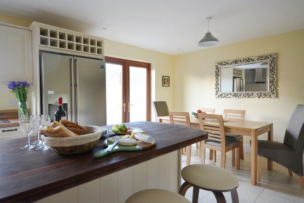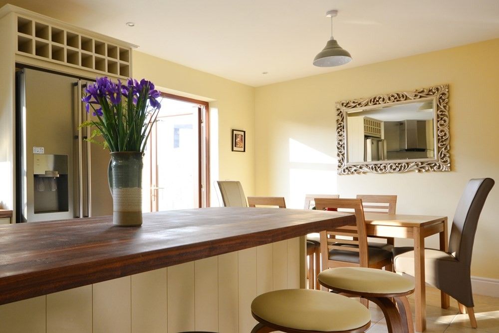 This lovely classic kitchen has all your culinary needs with electric hob, electric oven, microwave and a fridge freezer. Spacious and bright it adjoins the dining area with an extendable table and chairs. The dining area leads out onto the garden through french doors. There is a separate utility with a washing machine, dryer and storage space.