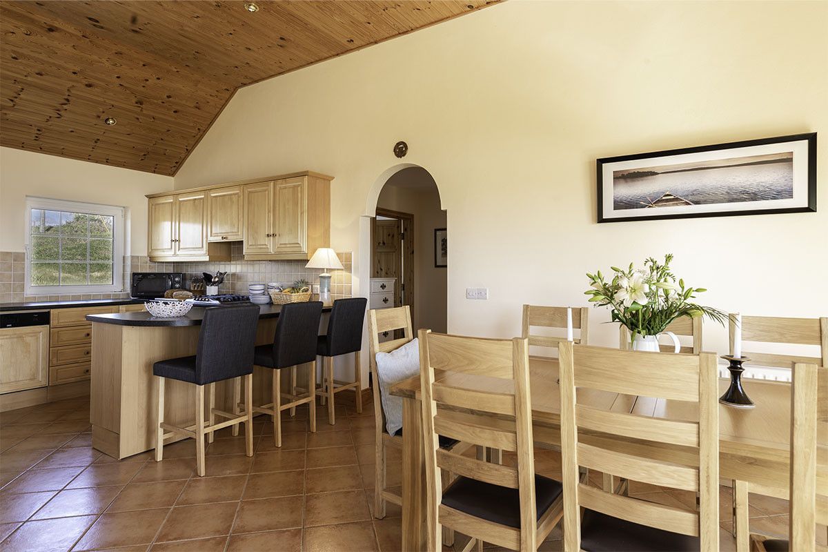 The warm wooden kitchen is fully equipped with large fridge freezer, gas hob and electric oven, double toaster, microwave and coffee maker - ideal for catering for a crowd. There is plenty of counter space and a large breakfast bar with three high chairs.