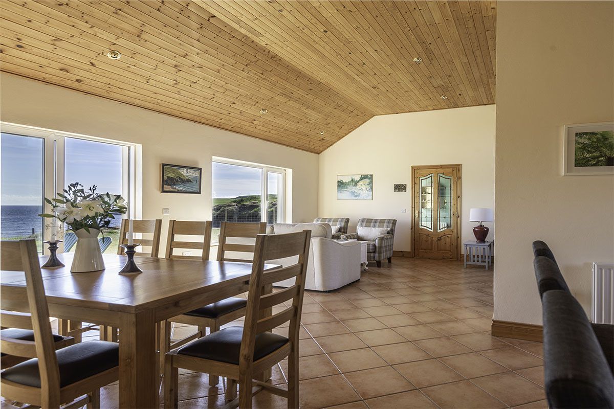Perfectly situated for a meal with a view, the solid wood dining table overlooks the sea and seats eight comfortably. The whole living-kitchen-dining area has a wonderful feeling of spaciousness and warmth, aided by extra-height wooden ceilings, dotted with spotlights.