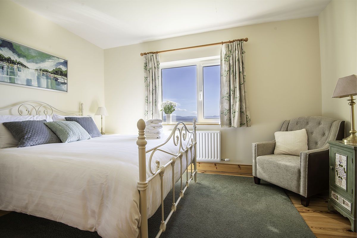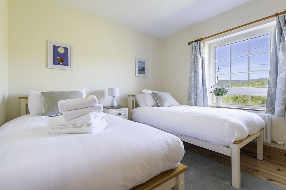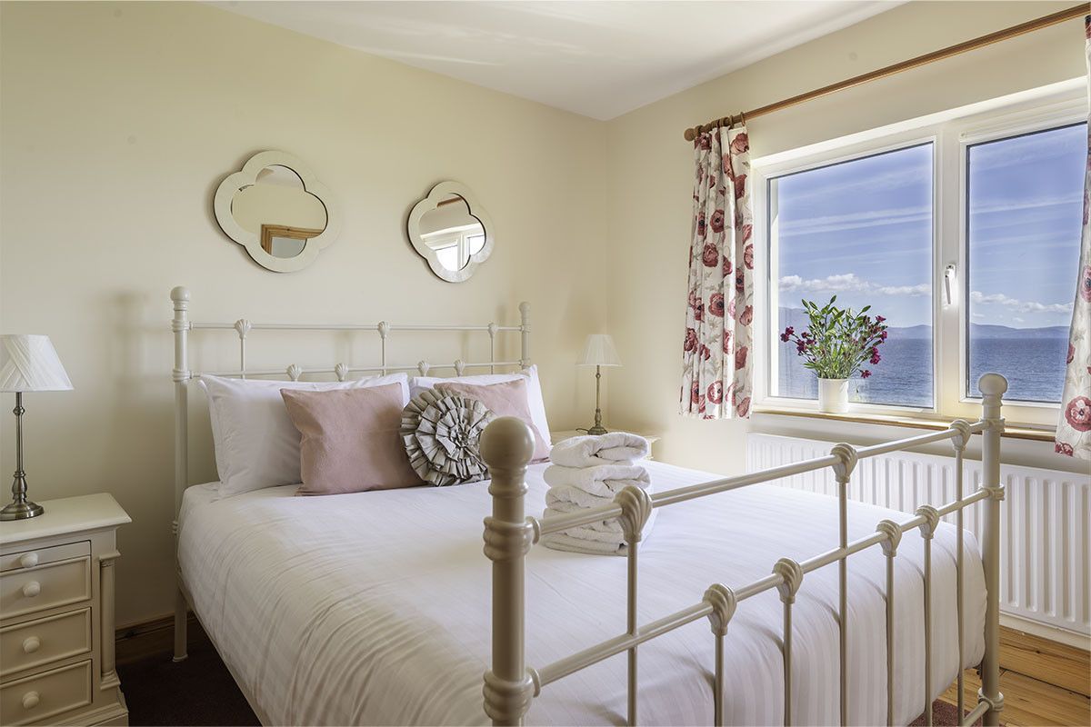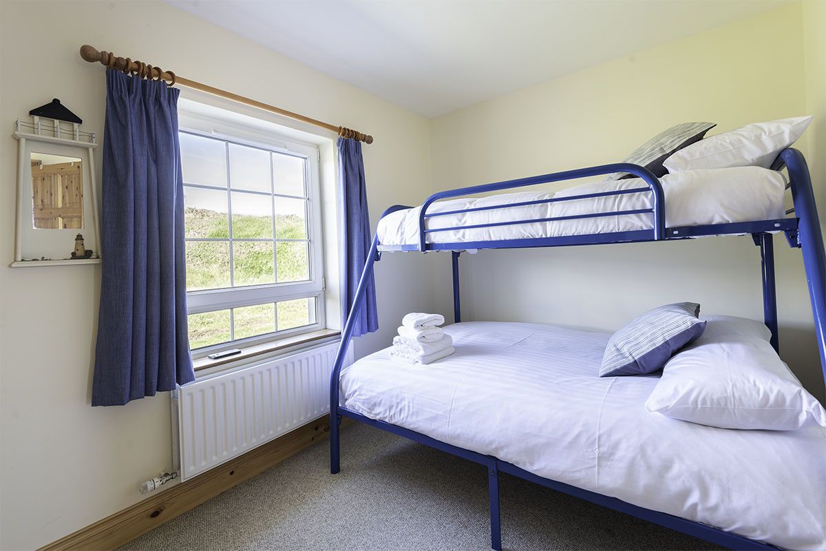 To the rear of the house, taking full advantage of the stunning scenery are two double bedrooms, both with en suite shower rooms, ample built-in wardrobes, wooden floors and large cosy rugs underfoot. To the front of the house are two further bedrooms, one spacious twin room and one with a bunk bed featuring a double bed on the bottom bunk. Both bright and comfortable twin rooms also have fitted wardrobes.
