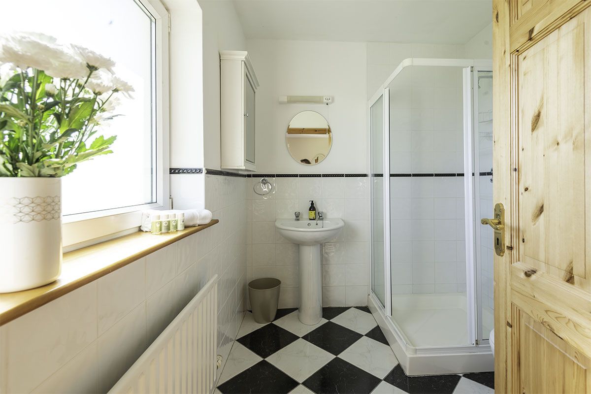 The spacious family bathroom has an extra large curved shower cubicle, and is tiled in classic style with fresh sea green and white tiles.