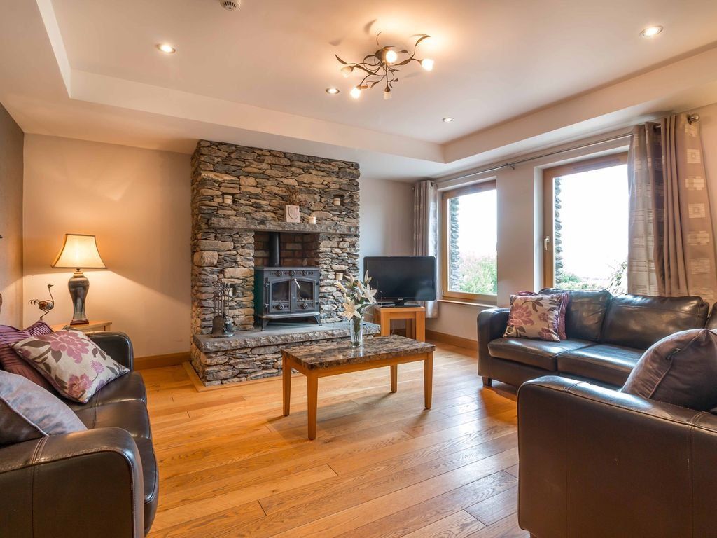 The ground floor comprises of a spacious living room. The dining and kitchen area is open plan.The living room offers a comfortable seating area, a floor-to-ceiling stone fireplace, which guarantees cosy evenings, and large panoramic windows, which offer absolute stunning views over the surrounding nature and Dingle town/bay.